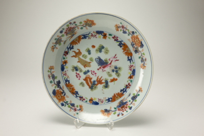 Dish on footring, spreading sides. Decorated in underglaze blue, various shades of green, pink, white, yellow, iron-red and gold. In the centre four carp among water plants surrounded by a band with scrolls, half-peonies and other flowers. On the sides four peony sprays. The reverse is undecorated. (Engels)
