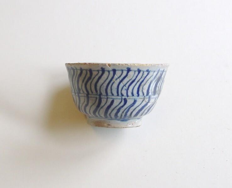 ext: indeling in 2 zones, gevuld met alternerend smalle en brede golflijnen; int. bodem: merkteken (kattenoog?) onduidelijk merkteken op bodem (ext.) standring iets uitgebogen rand (Nederlands)