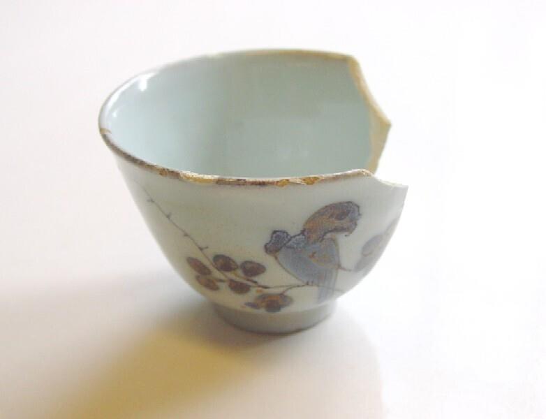 ext: vogel op bloemtak (2x); int. bodem: merkteken (artemisiablad?) standring, hoog uitgebogen rand (Nederlands)