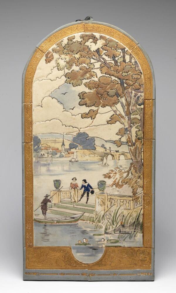 Sectieltableau met 'Venetiaans landschap'. De rand of omlijsting van het tafereel is goud gekleurd. Waarschijnlijk is dit paneel een model en onderdeel geweest van een wandbetimmering in een (scheeps)interieur. (Nederlands)