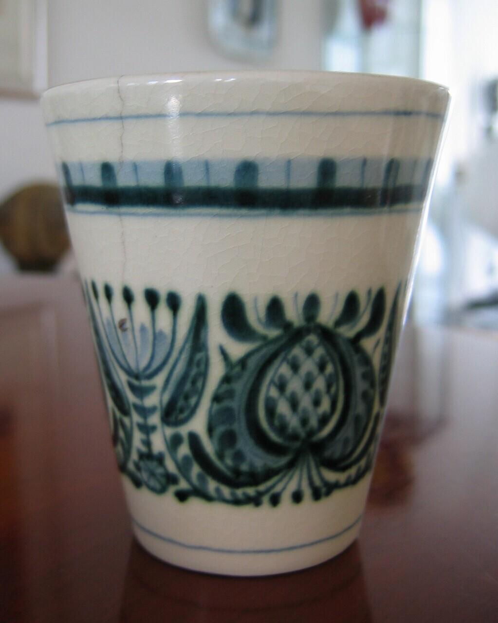 De beker is gedecoreerd met een band van gestileerd bloem- en bladwerk. Delvert of Groen Delfts In 1968 brengt De Porceleyne Fles een nieuwe collectie aardewerk uit; het zogeheten Delvert of Groen Delfts. H.J.H. Sanders ontwerpt de decors die bestaan uit acanthusachtige bladeren, afgewisseld met ranken, vruchten en hoeken. Na de tweede bakgang krijgt de decoratie een typisch blauw/groene kleur. De stukken zijn bedekt met een matte melkachtig glazuur. Bij een kleine productie blijkt deze kleur erg instabiel en hierom wordt de productie in 1976 gestaakt. In 1991 wordt nogmaals een poging gedaan het Delvert te produceren maar ook dan kunnen de problemen met de groene kleur niet worden opgelost. De productie wordt in 1991 definitief gestaakt. (Nederlands)