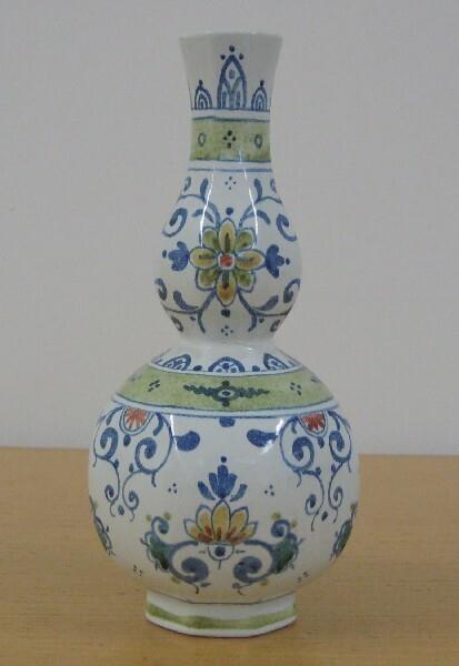 De achthoekige Knobbelvaas of -fles is gedecoreerd met aan traditioneel aardewerk ontleende motieven zoals bloem- en bladwerk. (Nederlands)