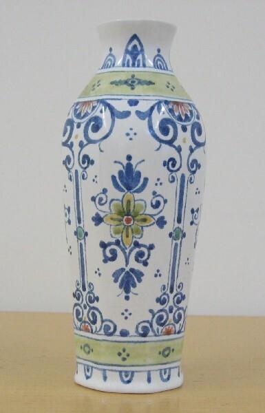 De achthoekige fles is gedecoreerd met aan traditioneel aardewerk ontleende motieven zoals bloem- en bladwerk. (Nederlands)