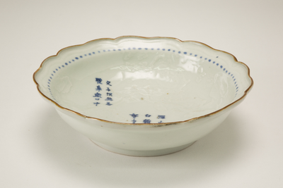 Witte kom op standring met gegolfde rand. Op de lip een bruine lijn. Op het plat in reliëf een tijger en twee personen. Hierover in blauw diverse chinese karakters.