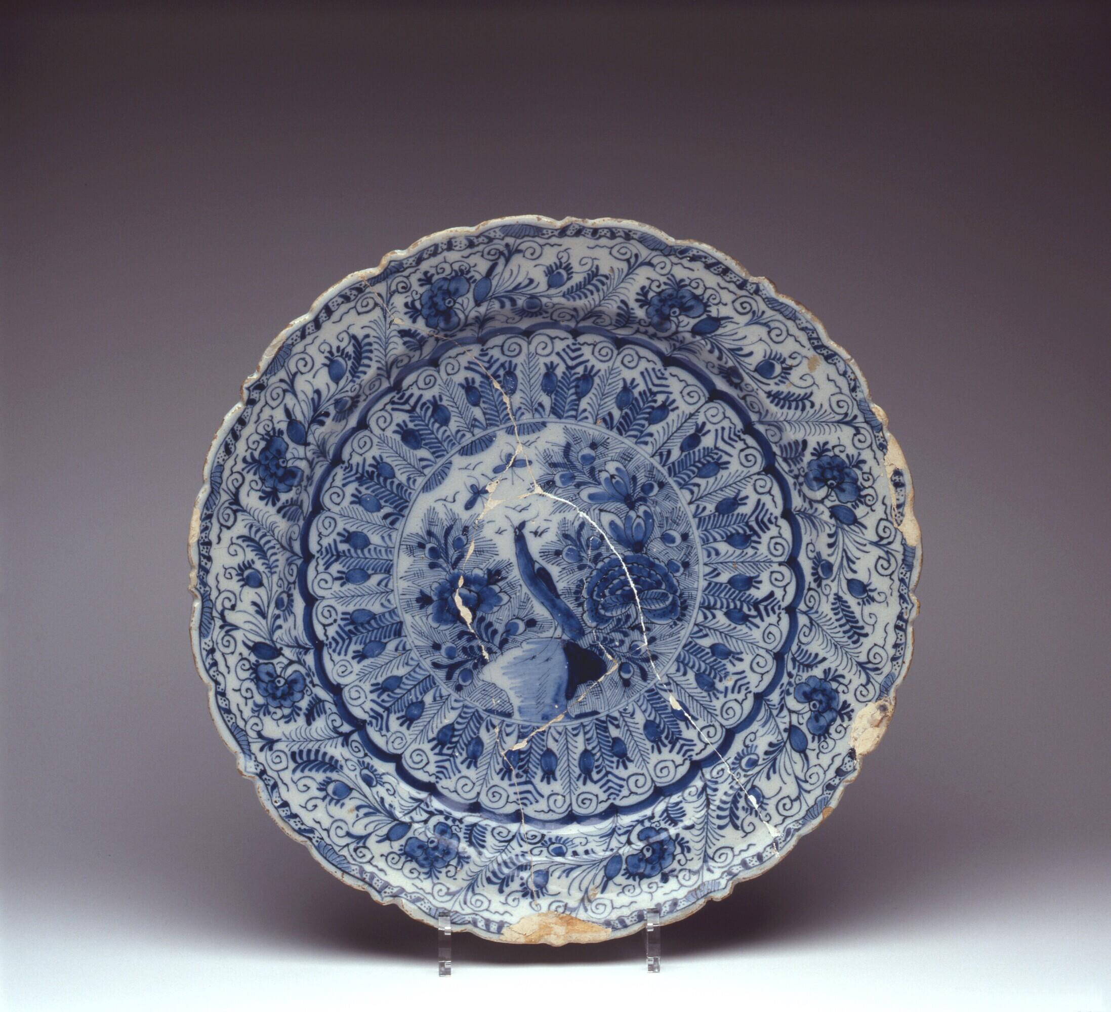 Ronde schotel, met een geschulpte rand, met op het plat een moerasachtig landschap met een naar insekten happende reiger, rechts een pioenstruik, links een bloesemtak. Het geheel is omgeven door straalsgewijs lopende uitsparingen met gestileerde takken, over de wand en rand een acht maal terugkerend motief bestaande uit gestileerde bloesemtakken, aan de onderzijde vier stippen. blauw onderglazuur, accoladenrand; gevederde blad- en bloemtakken, Chinese makelij (Nederlands)
