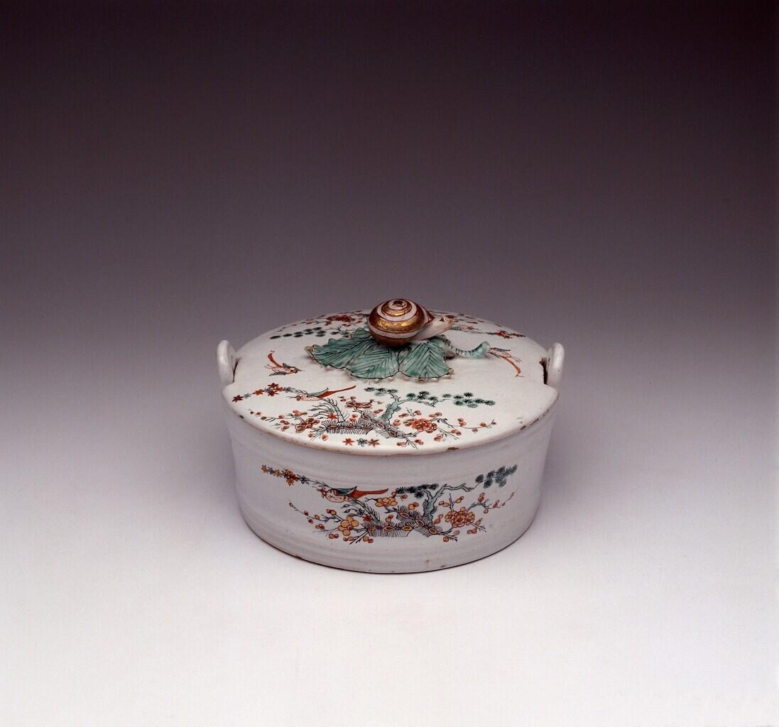 Ovale botervloot met rechtopstaande handgreepjes en deksel. De deksel heeft een knop in de vorm van een slak op een blad. De beschildering bestaat uit takken met bloesem, pijnbomen, vogels en bijeengebonden korenschoven. Het type decoratie van de botervloot is geïnspireerd op dat van het zogenaamde Kakiemon-porselein dat afkomstig is uit Japan. In eerste instantie was Chinees porselein met een blauwwitte decoratie de belangrijkste inspiratiebron voor Delfts aardewerk. Vanaf ongeveer 1660 werd ook vaker meerkleurig porselein ingevoerd door de VOC dat op haar beurt de Delftse industrie beïnvloedde. Ook Japanse objecten werden vanaf deze tijd steeds meer ingevoerd. Kakiemon-porselein was erg duur in de zeventiende eeuw, omdat het schaars was en daarom een geliefd onderwerp voor de Delftse plateelbakkers om te kopiëren. Het gebruik van een figuratieve knop op de deksel en het gebruik van een goud emaille duiden ook op invloeden van Europees porselein zoals Meissen. Ook deze fabriek maakte knoppen en handvatten in de vorm van bloemen, bladeren en takken. Meer onderzoek naar objecten van andere porseleinfabrikanten uit Europa kan wellicht meer duidelijkheid hierover geven. (Nederlands)