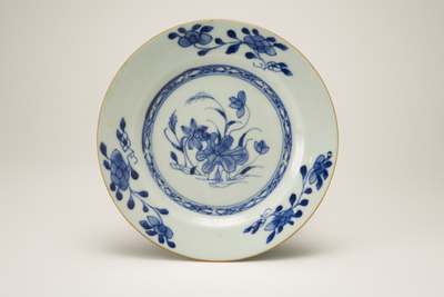 Wit bordje met op de lip een bruine lijn. Op het plat en op de rand blauwe bloemdecoraties.