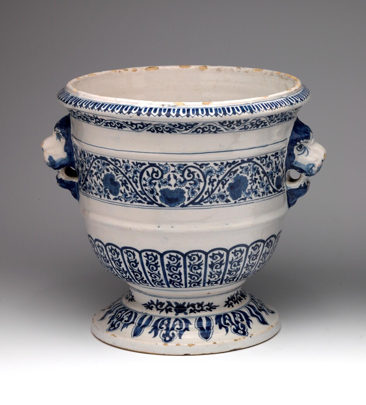 Bloem- of cachepot met hoge wand met een iets overhangende rand, handgrepen in de vorm van geperforeerde leeuwenkoppen waarin mogelijk ringen hebben gezeten. Ongeveer op het midden van de buik is een band met gestileerde bladeren, bloemen en ranken naar Kangxi-voorbeeld. Het motief van ranken en bladeren herhaalt zich onder de bovenrand. Aan de onderzijde is een band met panelen gevuld met voluten. De licht-geribde voeten zijn gedecoreerd met puntige afhangende bladeren alternerend met ruyi-motieven. (Nederlands)