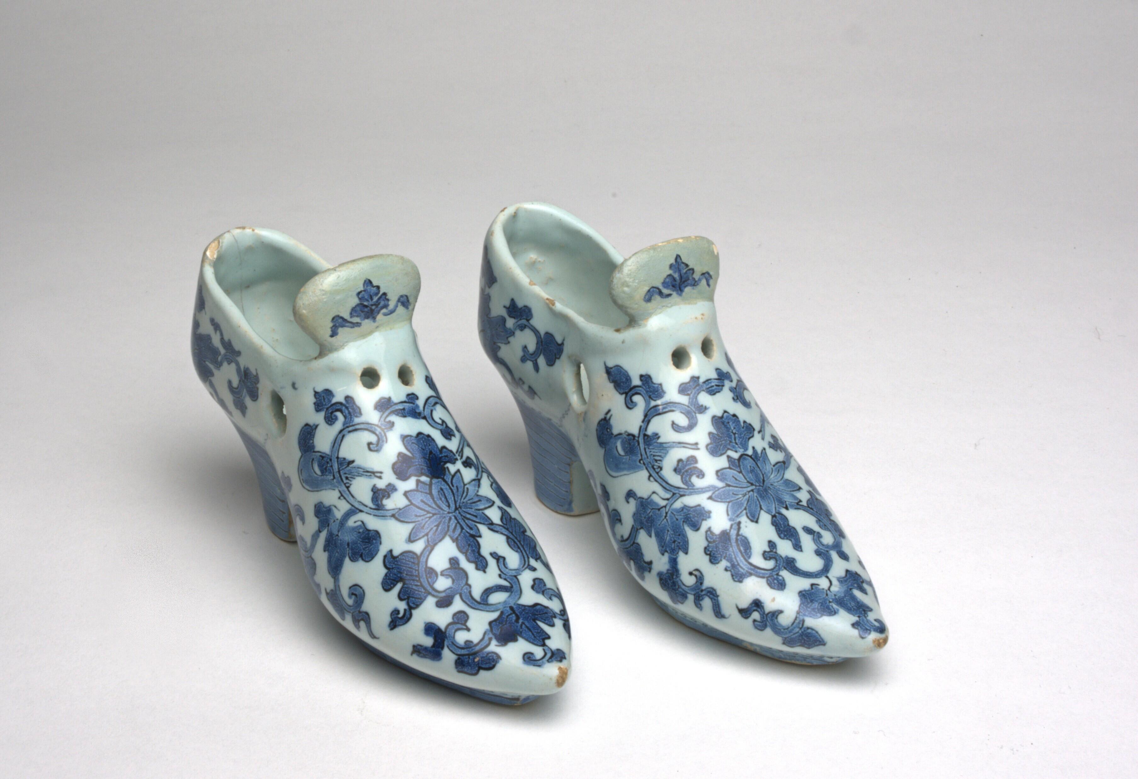 Stel muiltjes van tinglazuuraardewerk, hoge hak, puntneus, wreef met lip, twee kleine (voorzijde) en twee grote (zijkant) vetergaten, floraal decor van krulranken en twee vogels, blauwe hak, naad op hiel en langs de voet, decor met donkerblauwe trek. (Nederlands)