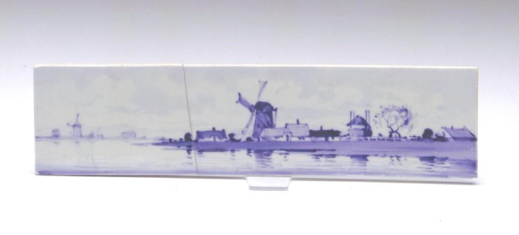 Langwerpige, rechthoekige tegel met een karakteristiek Hollands waterlandschap met molens. (Nederlands)