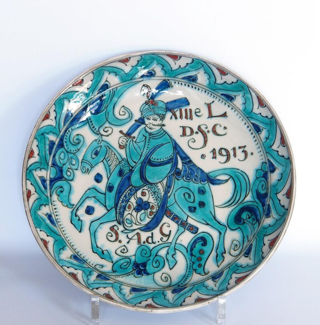 Schotel met decoratie van een ruiter met zwaard in de kleuren rood, blauw en turkoois. Achter de ruiter staats de tekst: XIIIe L D.S.C. 1913. Onder het paard zijn de letters S. A. d. G. (Nederlands)