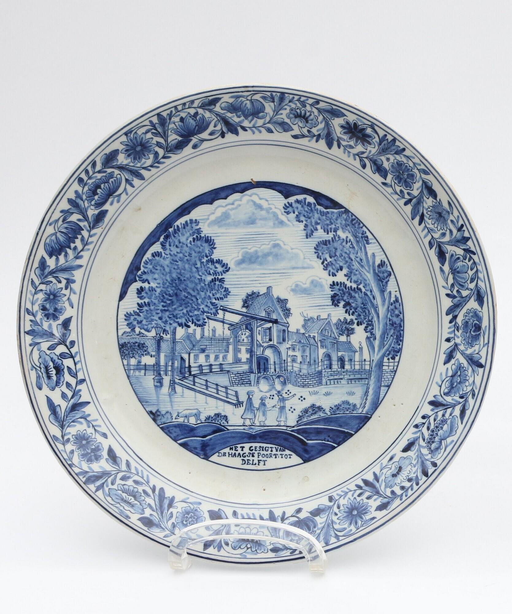 Delfts blauwe schotel met de voorstelling van een stadsgezicht en de inscriptie 'het Gesigt van de Haagse Poort: tot Delft'. Dit is een Franse kopie van een exemplaar van Fries tinglazuuraardewerk. (Nederlands)
