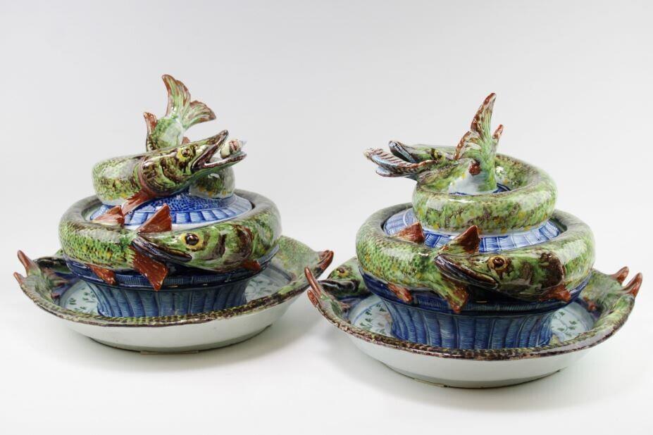 Paar terrines in de vorm van een mand met snoeken (Nederlands)