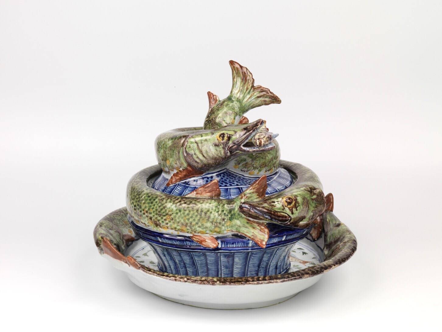 Terrine in de vorm van een mand met snoeken (Nederlands)