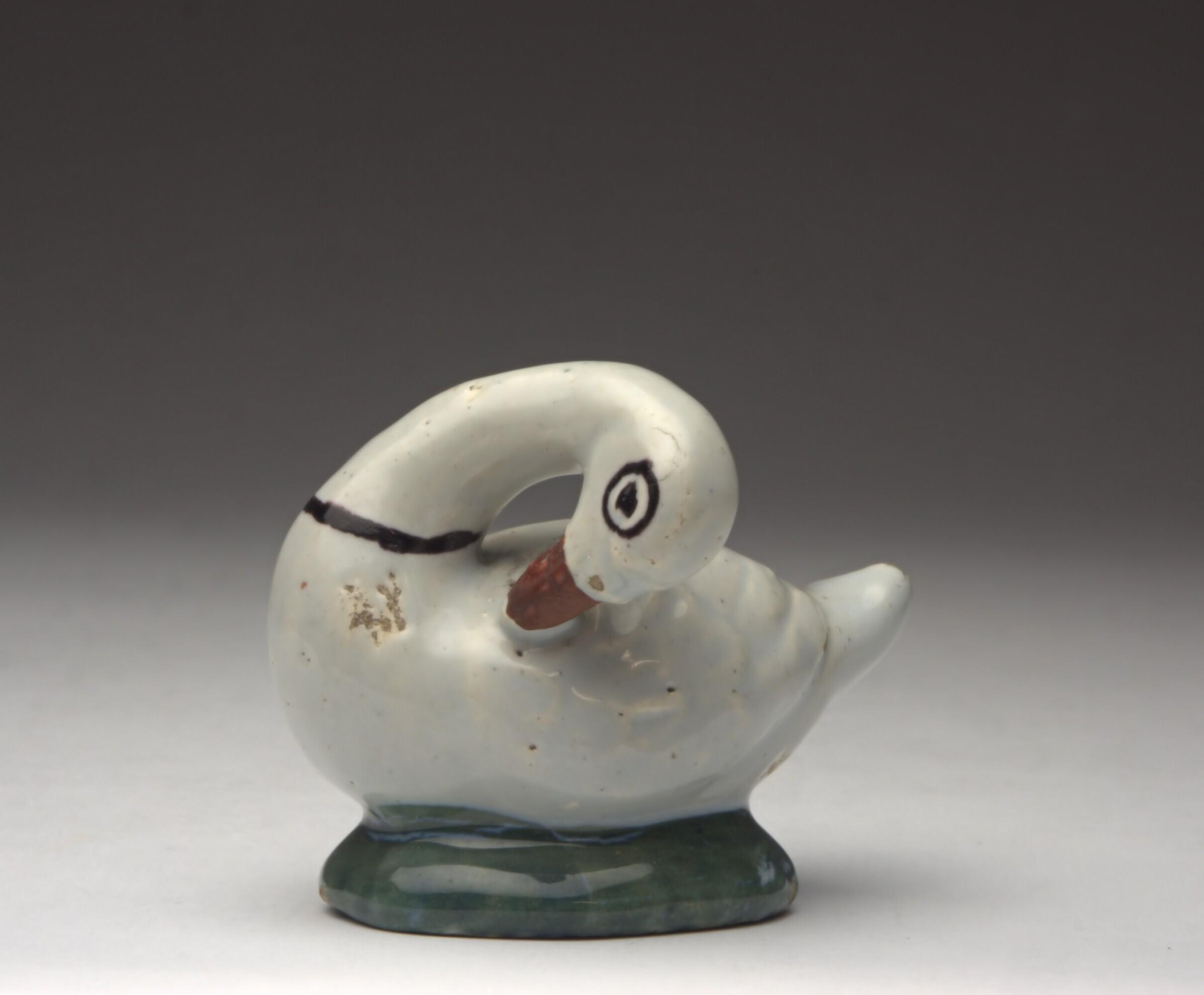 Beeldje van een zwaan, de kop naar links gewend, met naar achter gebogen hals. De veren in relief weergegeven, op blauwgroen gerond voetstukje. Zwart-rode snavel, donker mangaan bijna zwarte ogen, met halsring. (Nederlands)