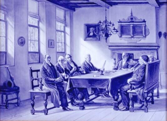 Plaque met afgebeeld de vergadering van de Kerkenraad der Hervormde Gemeente van Kralingen, ouderlingen en diakenen in de consistoriekamer. (Nederlands)