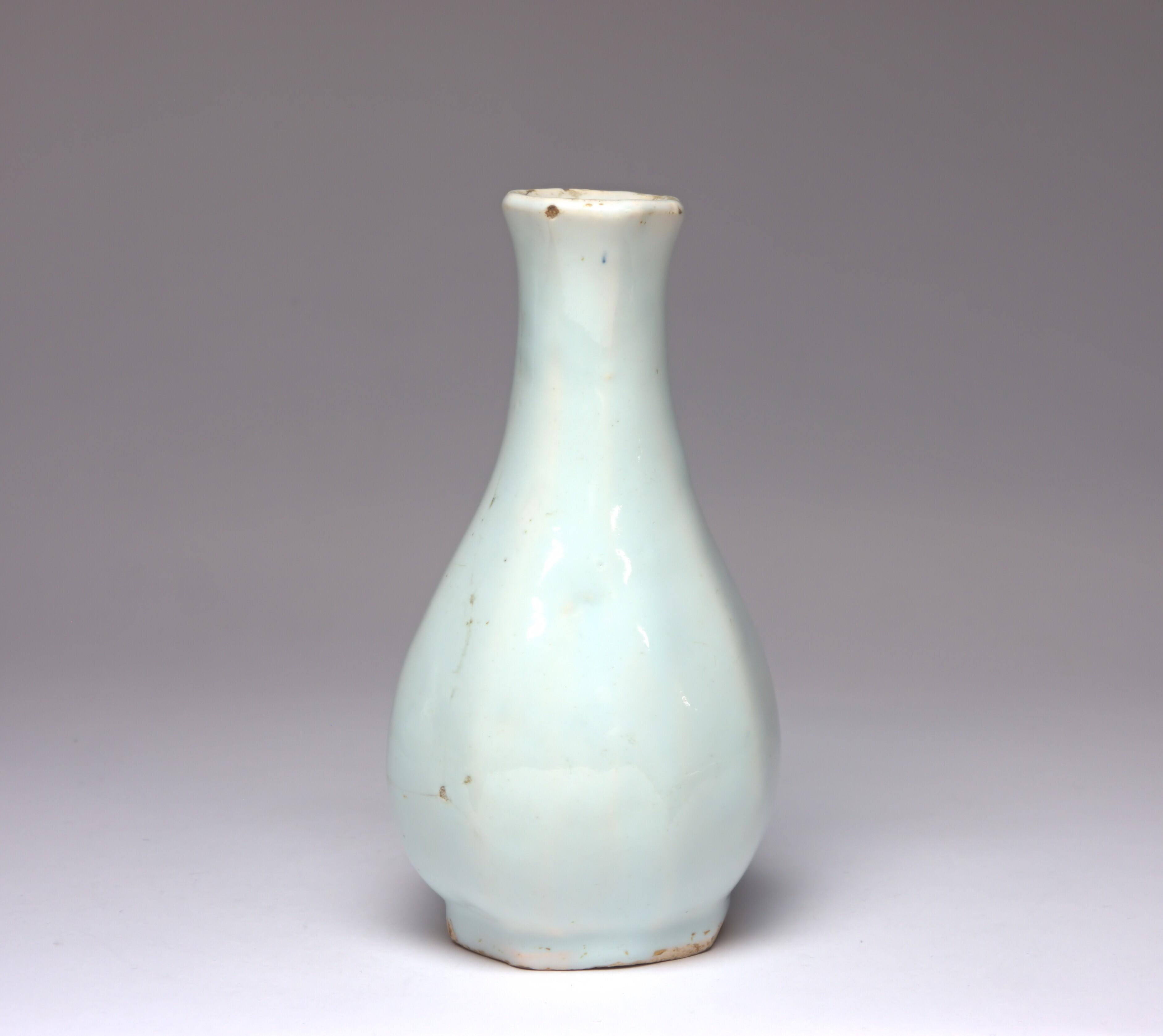 Achtkantige vaas met ingesnoerde voet; peervormig en smal toelopende hals waarvan de mond iets naar buiten loopt; ongedecoreerd; (Nederlands)