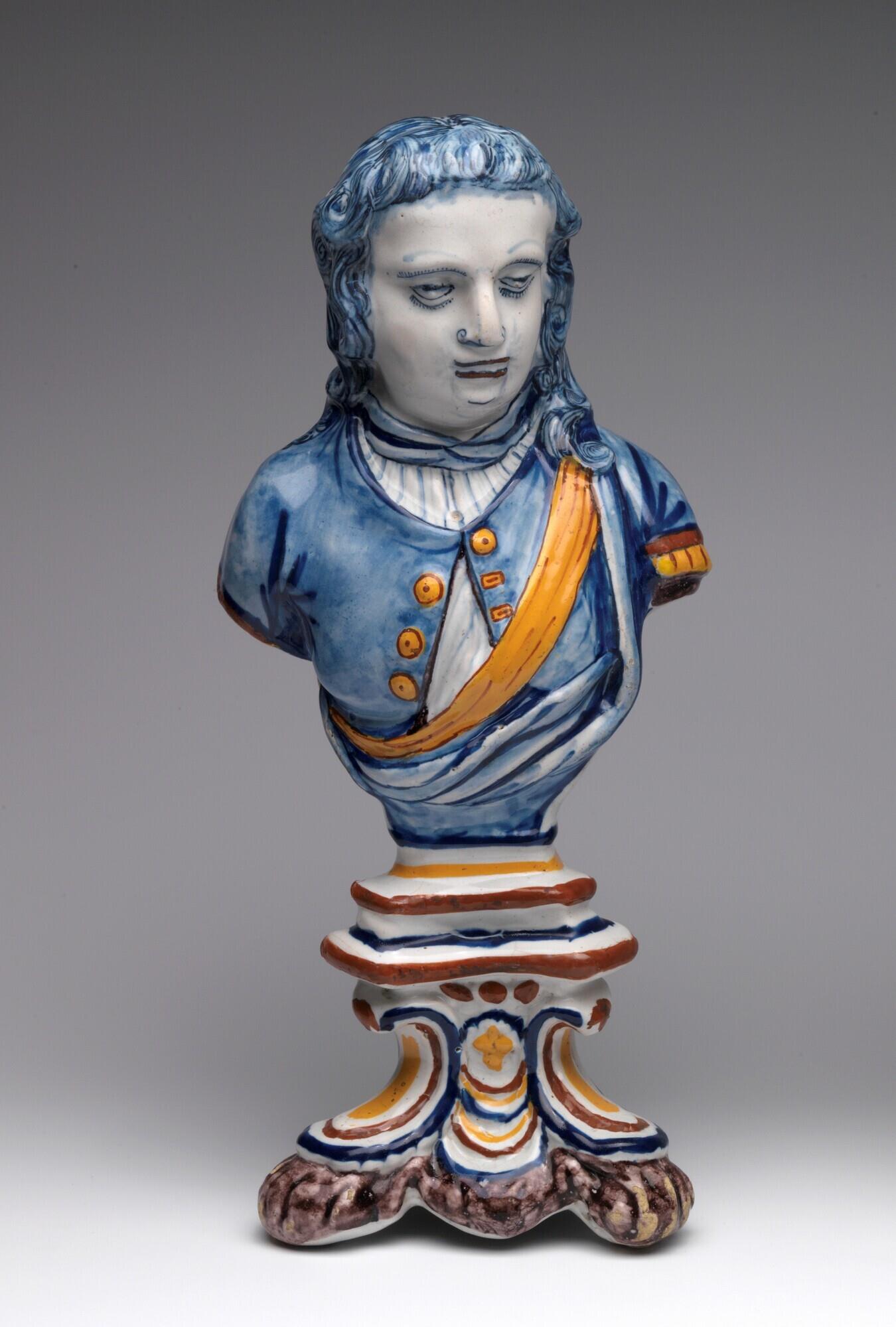 Beeld in de vorm van een borstbeeld van een man, mogelijk een oranjevorst, rustend op een sokkel met voluutvormige driepotige voet. De man draagt een blauw jasje met gele knopen over een blauwwit gestreept hemd en heeft over zijn borst een oranje sjerp en om zijn hals een blauwwitte doek. Zijn haar is blauw, lang en golvend. Het voetstuk heeft mangaankleurige poten en is versierd met gele, bruinrode en blauwe banden en noppen. De achterzijde en zijkanten van het borstbeeld is m.u.v. het hoofd onbeschilderd. (Nederlands)