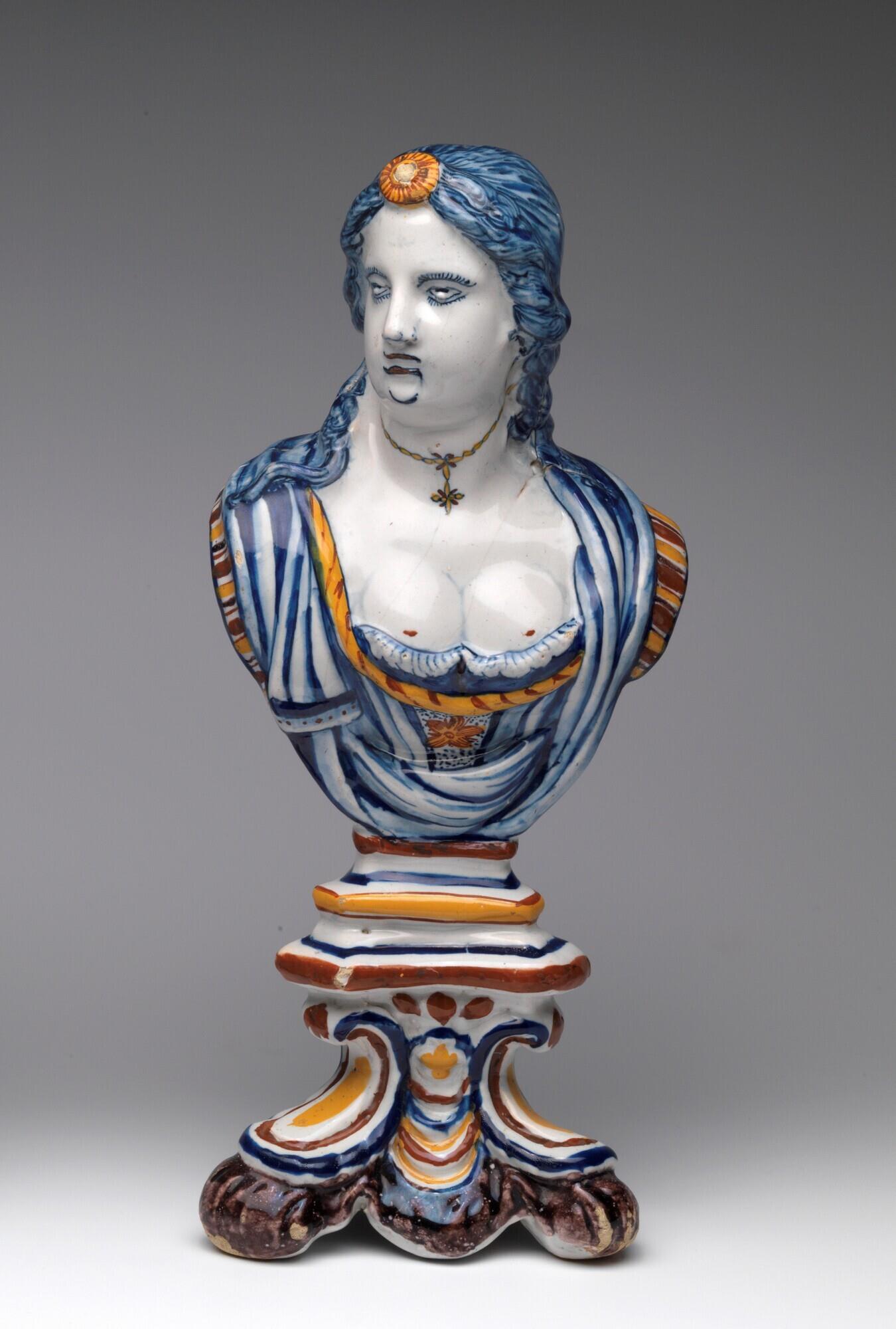 Plastiek van een borstbeeld van een vrouw, mogelijk een oranjevorstin||Delft||1750 - 1775||tinglazuuraardewerk||PDA 45-B |