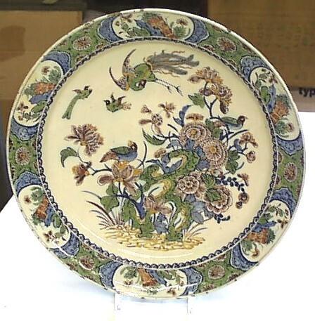 Schotel, in famille verte-stijl, op het plat gedecoreerd met sierstruiken met bloeiende bloemen (onder meer de pioenroos) waarin papegaaien, gelegen aan water. In de lucht drie vogels waarvan de grootste duikelt. Op de rand zes ovale velden waarin rieten schoof geflankeerd door bloemen. Het ovaal afgesloten met lambrequinmotief, met tussen de ovalen steeds een rozet. Tegen de binnenrand een aaneensluitende reeks van gestileerd bladmotief. (Nederlands)