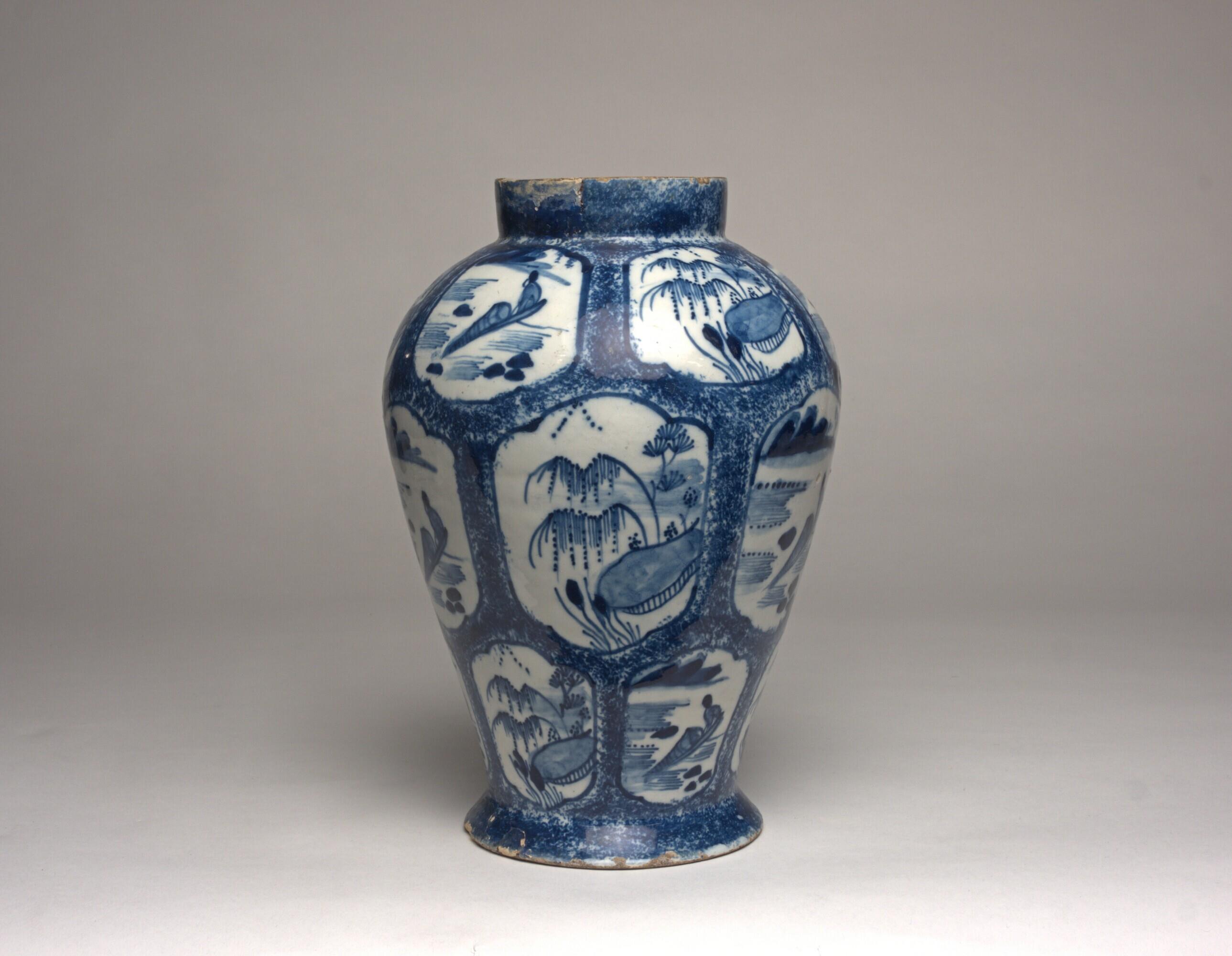 balustervormig, geheel bedekt met gespat fond waarin boven elkaar 3 x 6 vakken met om en om Chinees waterlandschapje en bootje, tussenruimte gespritst, Chinese navolging, decor blauw onderglazuur. Rondom boven elkaar 9 x 6 vakken met om en om landschapje en bootje. Tussenruimte gespritst. (Nederlands)