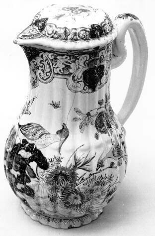 De geribde kan met los deksel is beschilderd met een chinoiserie voorstelling in het Imari-palet. De voorstelling toont vogels op een rots en bloemen achter een hek. Langs de bovenrand is een band geschilderd met lambrequins alternerend met ranken uitgevoerd in de spaartechniek. De kan is voorzien van een oorvormig handvat. (Nederlands)