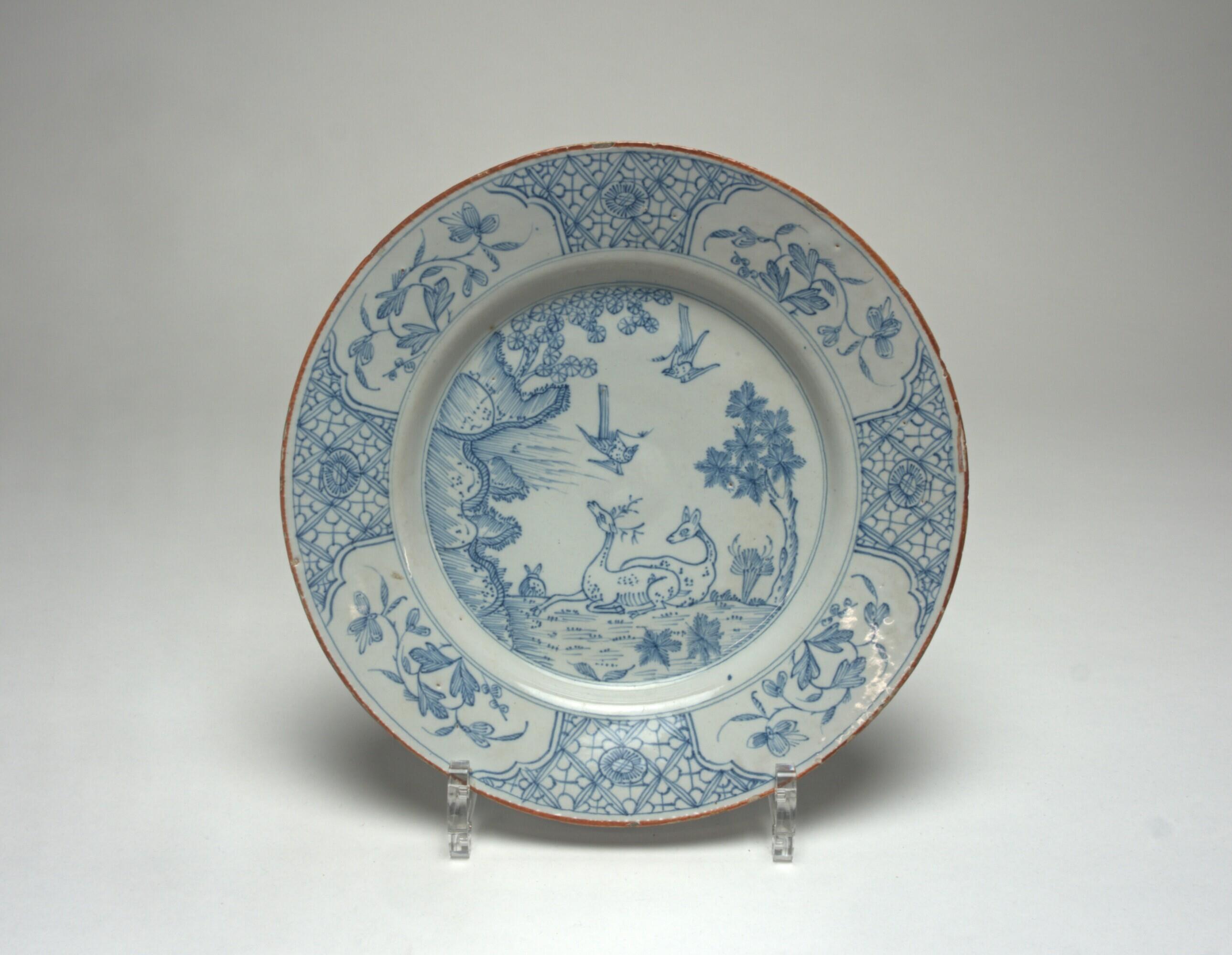 rond met in het plat een landschap waarin liggend hert en hinde, een op de rug gezien konijn, rechts een boom en struik, links een met de bordronding meebuigende rotspartij waarop dennenboom, in de lucht twee duikende vogels, op de voorgrond losse bladeren, op de rand servetwerk met bloemmotief, daarin uitgespaard vier gelobde velden waarin bloesemtak, de buitenrand is oranjebruin, aan de achterzijde acht Chinese ornamenten afgewisseld door kruisje in cirkel. Decor blauw onderglazuur (rotsachtig landschap met herten, vogels, konijn, etc. Rand in vakken afwisselend met bloemen en ornamenten). Roodbruine bies op de rand. putjes aan achterzijde; pensporen (Nederlands)