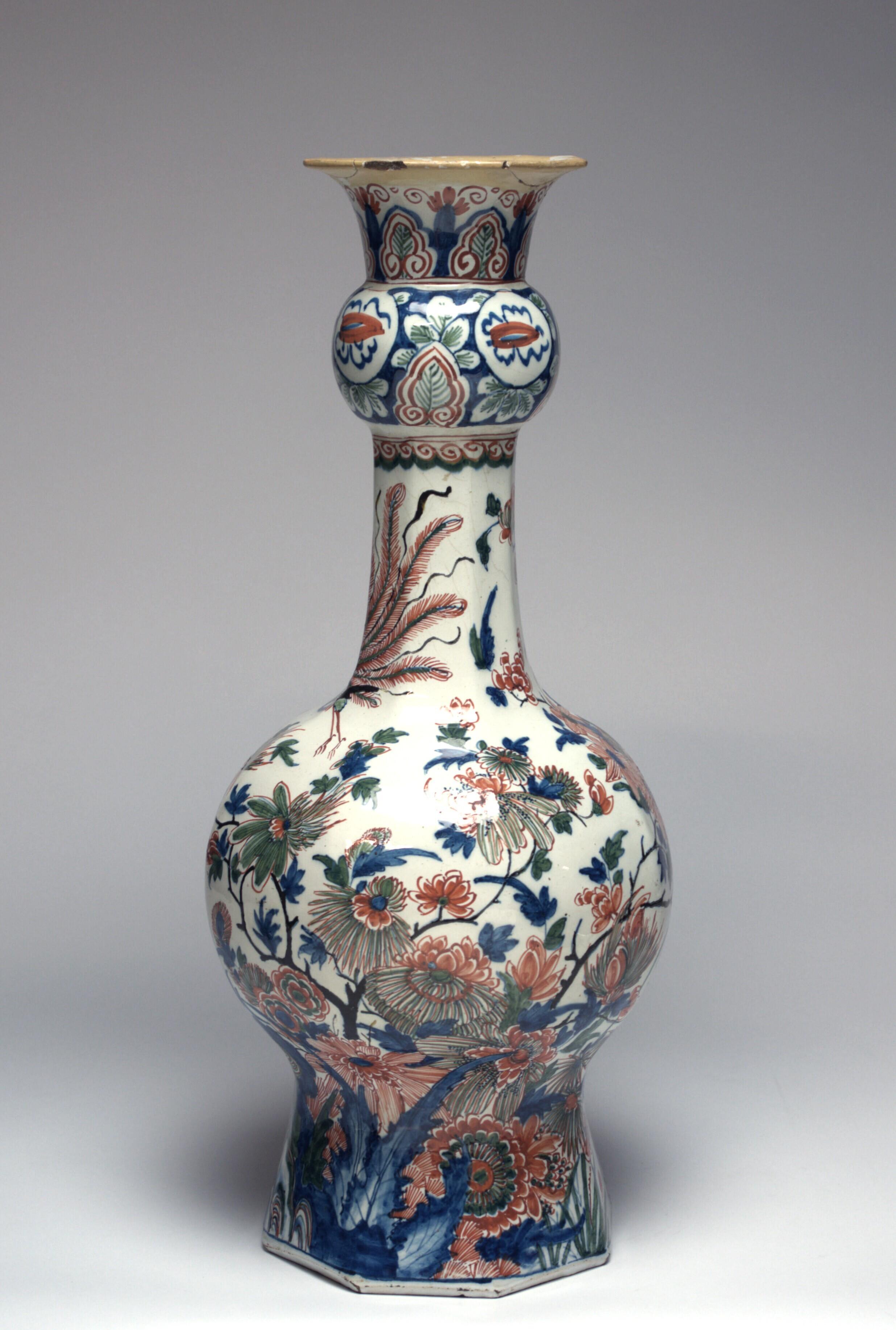 De octagonale knobbelvaas of -fles heeft een bolle buik, slanke hals met uitdijende voet en lange hals met knobbel en kragende mondopening en is gedecoreerd met planten, bloemen, bloesemtakken, rotsen en water. Centraal staat een pauw op een rots waarboven een duikelende fenix. Op de halsknobbel velden met geluksteken afgewisseld door florale lambrequins; op deksel floraal decor met siervogel. (Nederlands)