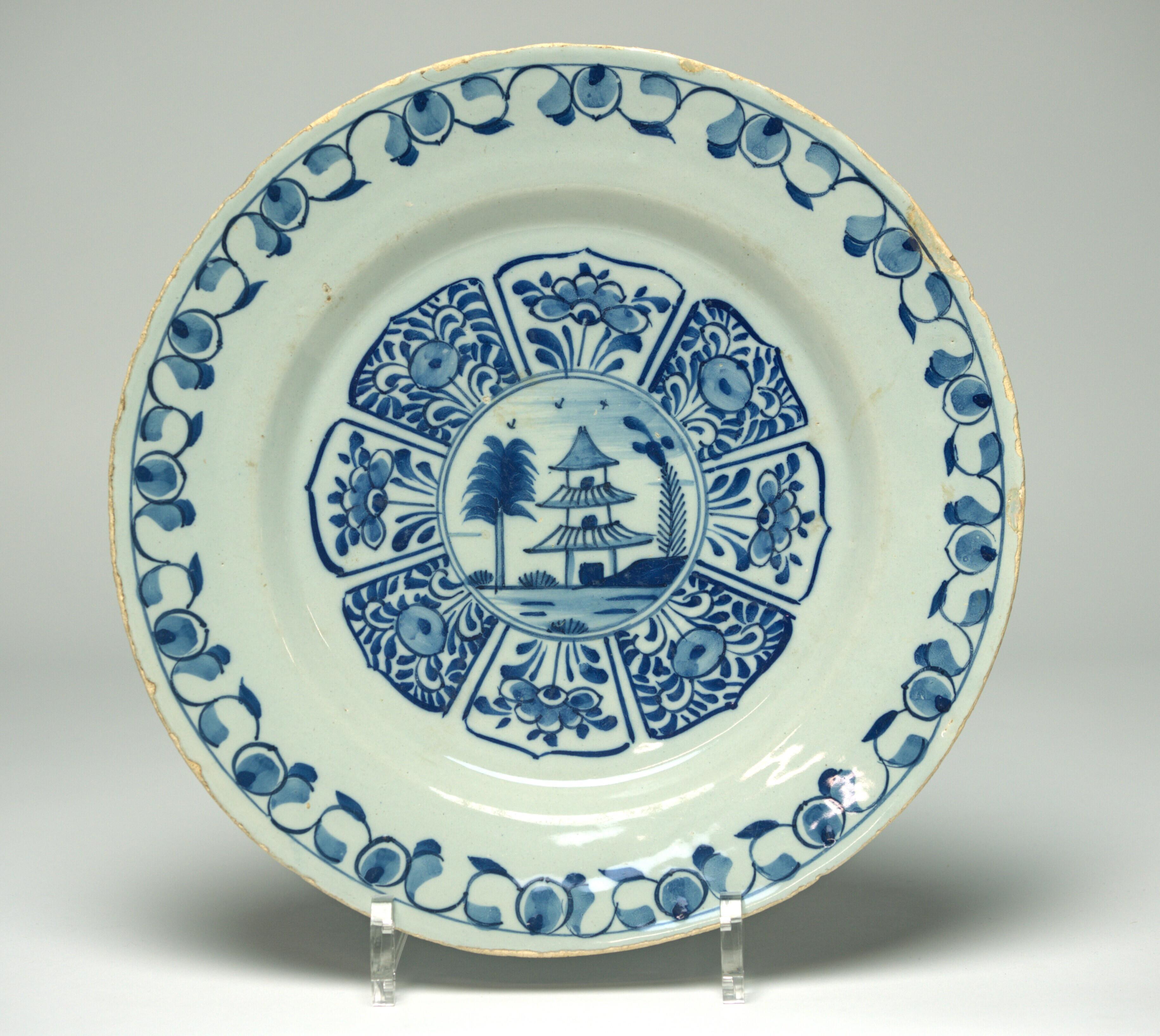 rond, op het plat een Chinese tempel in landschap, omlijst door dubbele concentrische cirkel omkransd door acht, los van elkaar staande palmetvormige velden waarin bloemornament, op de rand een slingerkrans van bessen; Decor blauw onderglazuur. Aan Chinees voorbeeld ontleend. Chinese tempel in landschap, 6 gebloemde vakken en ornamentale rand. (Nederlands)