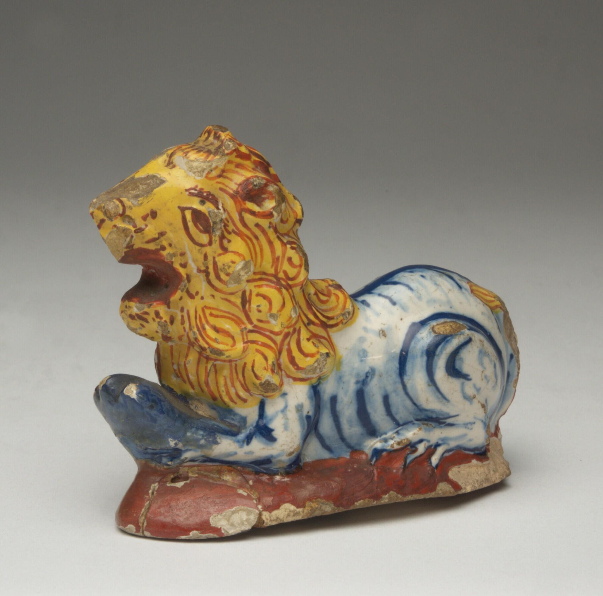 Plastiek in de vorm van een leeuw, liggend met open bek op voetstuk, tussen de voorpoten een stuk vlees. De manen en huidplooien zijn geaccentueerd met lijnen. (Nederlands)