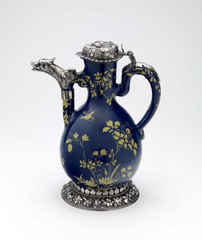 Kan met oor en kleine tuit, met op de zogenaamde Nevers-blauwe ondergrond een groengele chinoiserie van planten en een bloemornament. Een zilveren tuit in de vorm van een leeuwenkop en een hartvormig deksel waarin geciseleerde Bacchus en druivenranken. Op het oor een wingerdblad. (Nederlands)