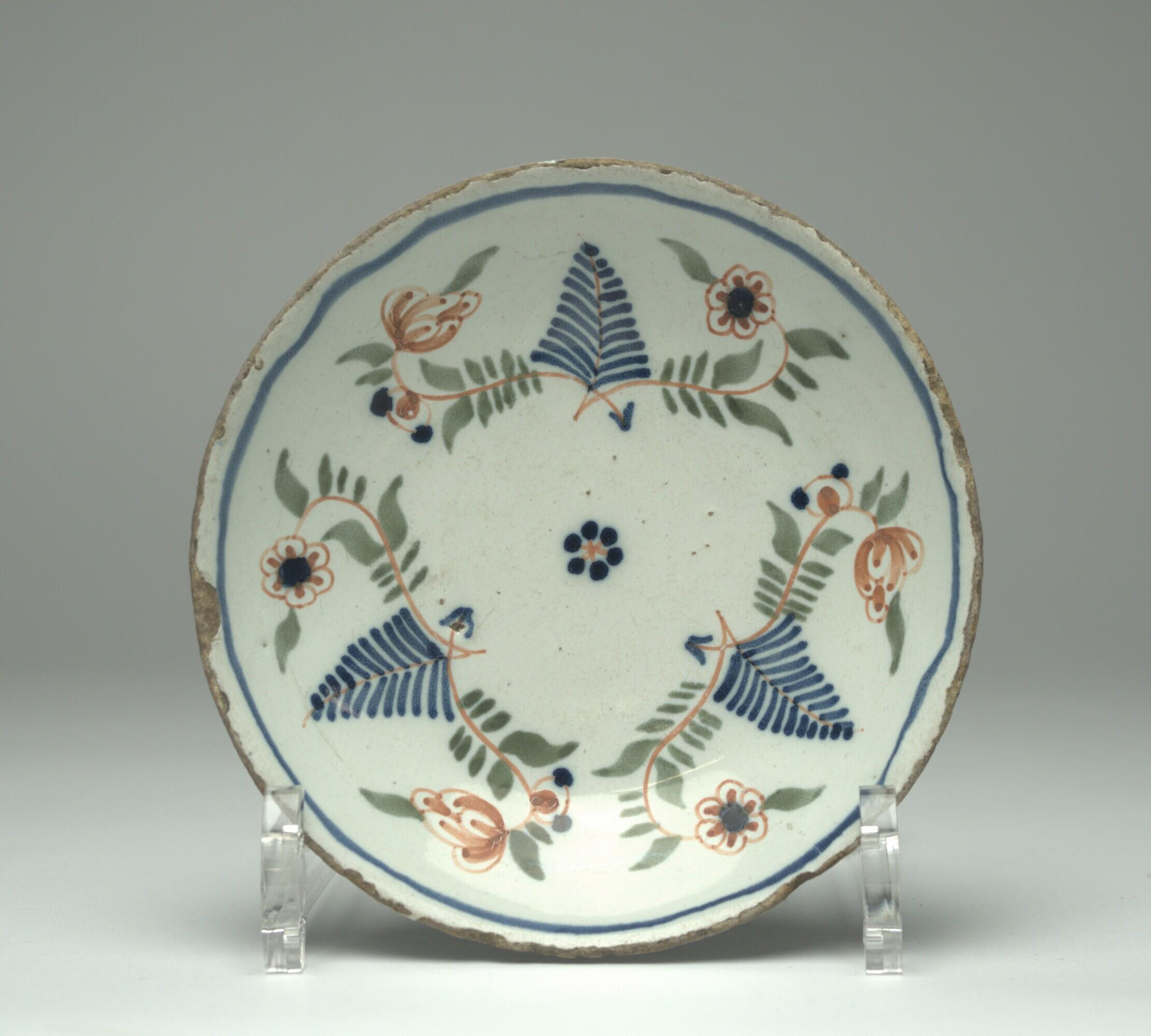 rond met standring, komvormig, in het plat drie gestileerde gespreide bloesemtakjes rond een klein rozet, op de rand een blauwe bies, kleuren lichtgroen en roodbruin. Drievoudig, enigzins gestileerd polychroom bloemendecor onderglazuur. Blauwe bies langs de rand. (Nederlands)
