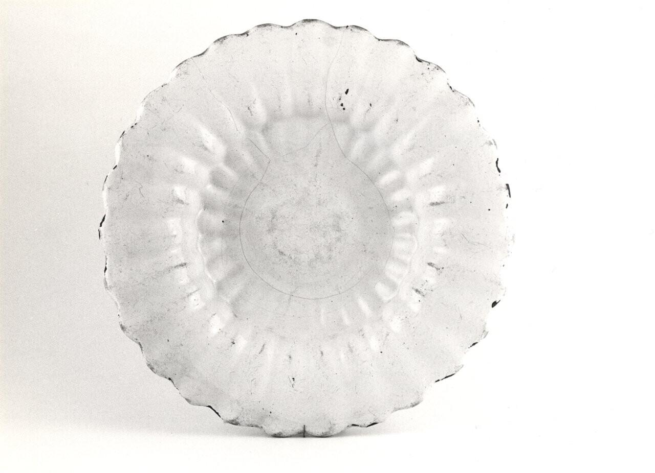 Ongedecoreerde plooischotel, de rand opgebouwd uit vele, smalle knorren. In het plat lobben die bij de buitenrand en halverwege het plat verdwijnen. (Nederlands)