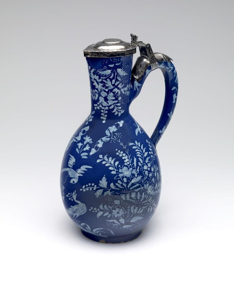Kan met oor en kleine tuit, met op de zogenaamde Nevers-blauwe ondergrond in lichter wit-blauw uitgevoerde decoratie van planten en bloemen. Zilveren deksel bestaande uit gestileerd wingerdblad en ingegraveerde ornamenten. (Nederlands)