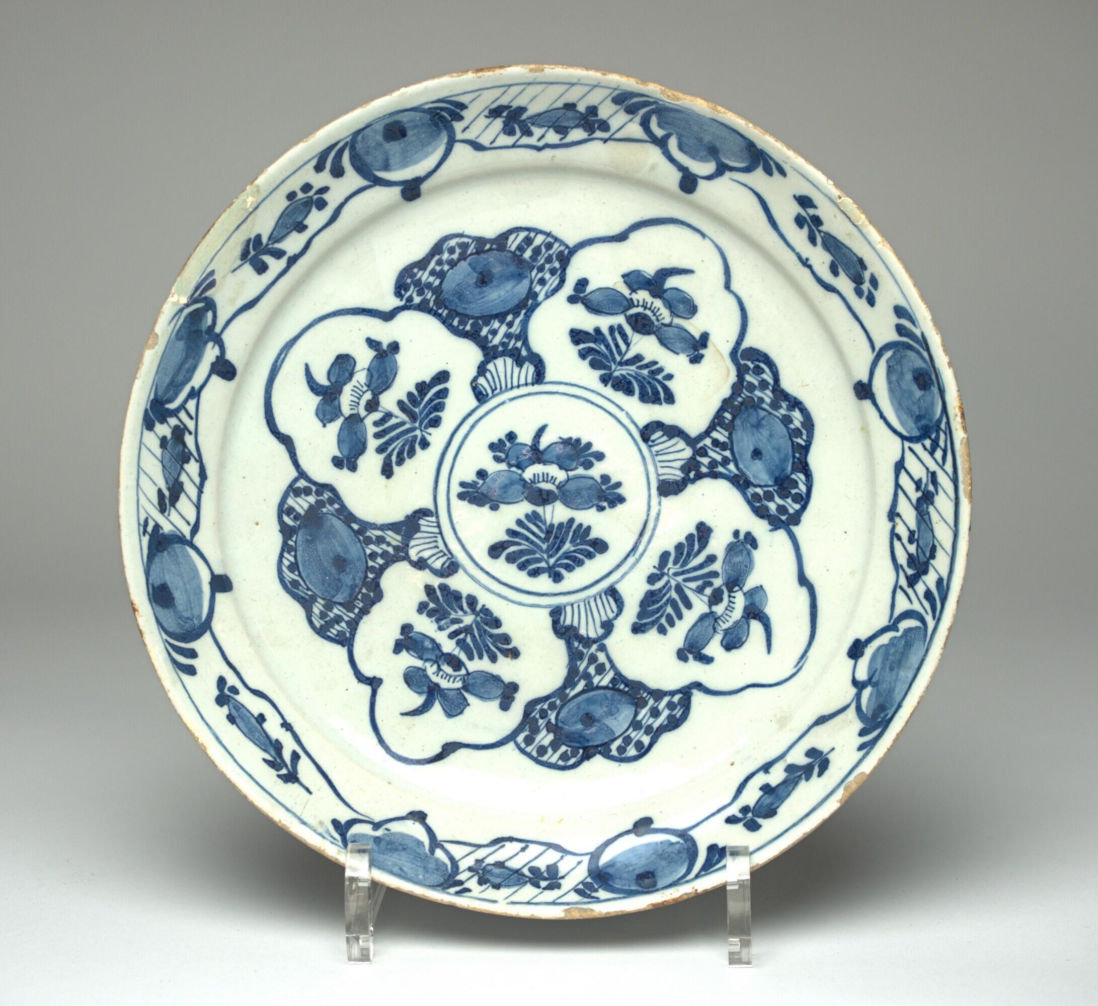 rond met smalle rand, in het plat dubbel kleine concentrische ring die bloemornament omvat, hetzelfde ornament keert terug in vier grote en vier kleine, tegen de concentrische ring aangebrachte palmetvormige uitsparingen, waarin respectievelijk een floraal en een gearceerd ornament, nog eens vier velden waarin een blauw ovaal op een achtergrond van stippen en strepen daartussen, op de rand gestileerde florale ornamenten van tweeërlei soort en aan elkaar verbonden met slingerlijnen, afgewisseld door langwerpige florale ornamenten tegen - om en om - een gestreepte achtergrond, vrije navolging Chinees decor. Decor blauw onderglazuur (ornamentaal met toepassing van bloemmotieven). Vrije navolging van Chinees decor. (Nederlands)