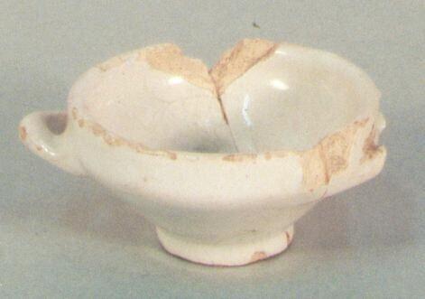Korte trechtervormige schaal met verticale ronde wand, rond standvlak; schuinstaand C-vormig oor; (Nederlands)