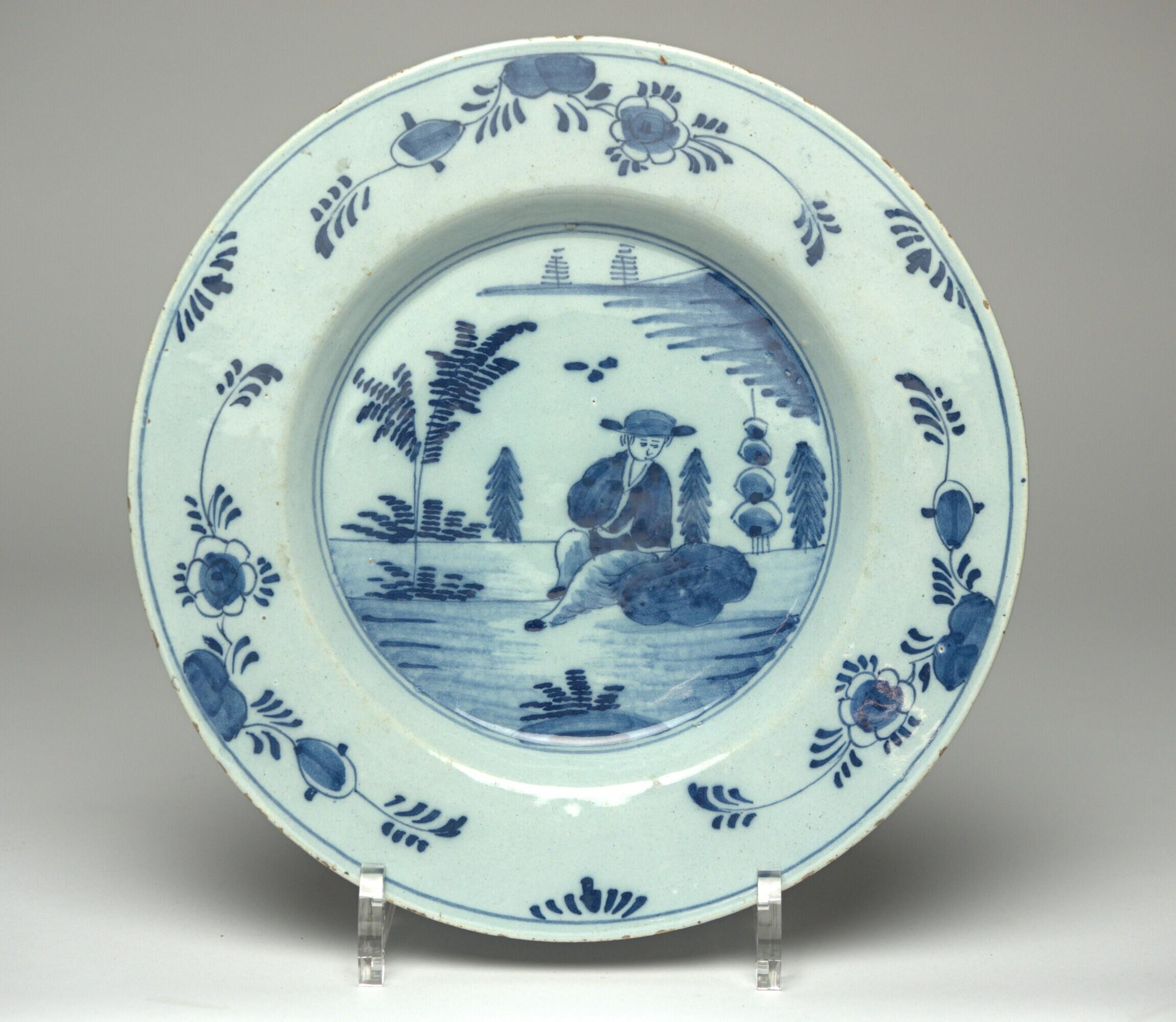 rond zonder standring, op het plat een landschap met zittende Chinees op een rots, hij draagt een plat hoofddeksel, op de rand driemaal een rots begroeid met twee gespreide ranken. Decor blauw onderglazuur (landschap met zittende jonge man, gebloemde rand). Grove navolging van Chinees decor. (Nederlands)