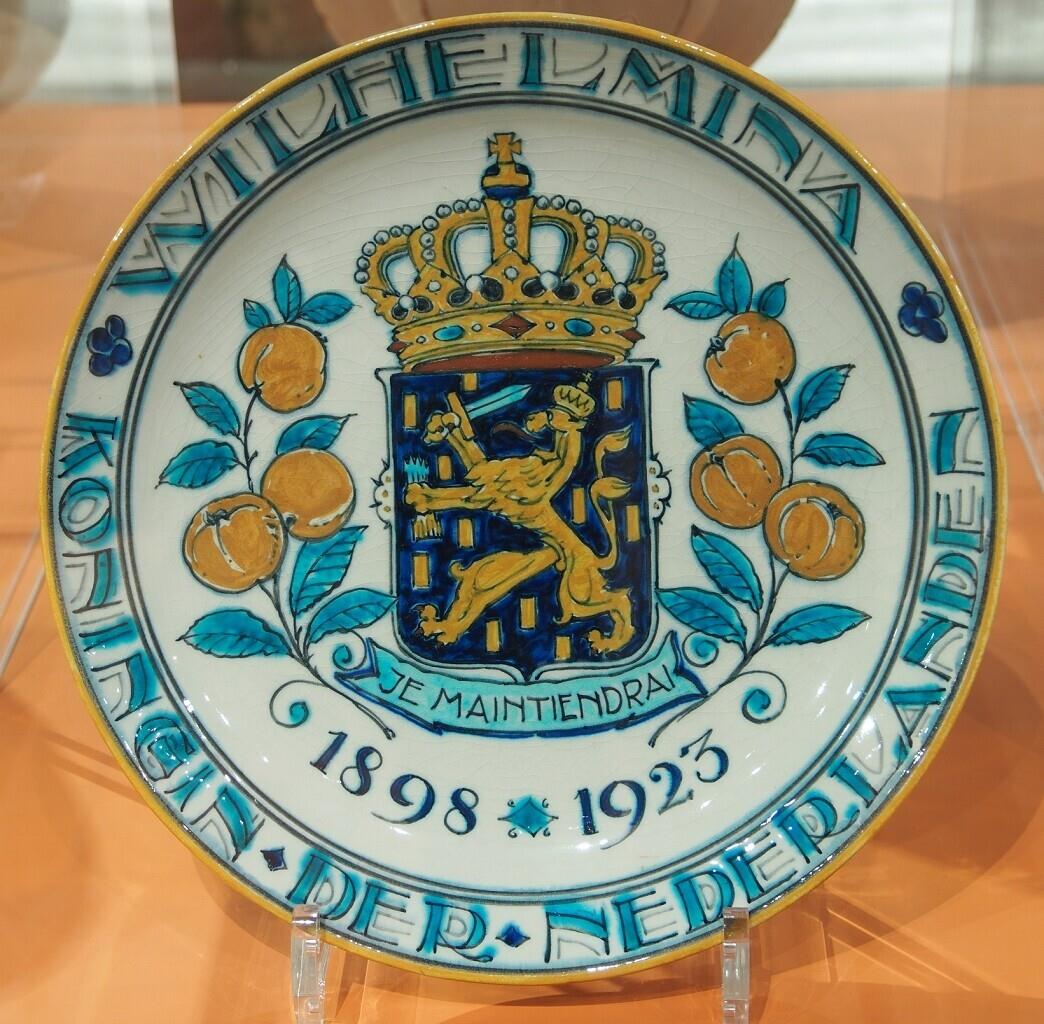 Het bord, vervaardigd ter gelegenheid van het 25-jarig regeringsjubileum van koningin Wilhelmina in 1923, is aan de voorzijde gedecoreerd met het gekroonde wapen van de koningin der Nederlanden. Het schild wordt omgeven door takken met oranjeappels met hiertussen de banderol met het opschrift 'Je Maintiendrai'. Op de rand staat vermeld 'Wilhelmina Koningin der Nederlanden'', en de jaartallen 1898 - 1923. (Nederlands)