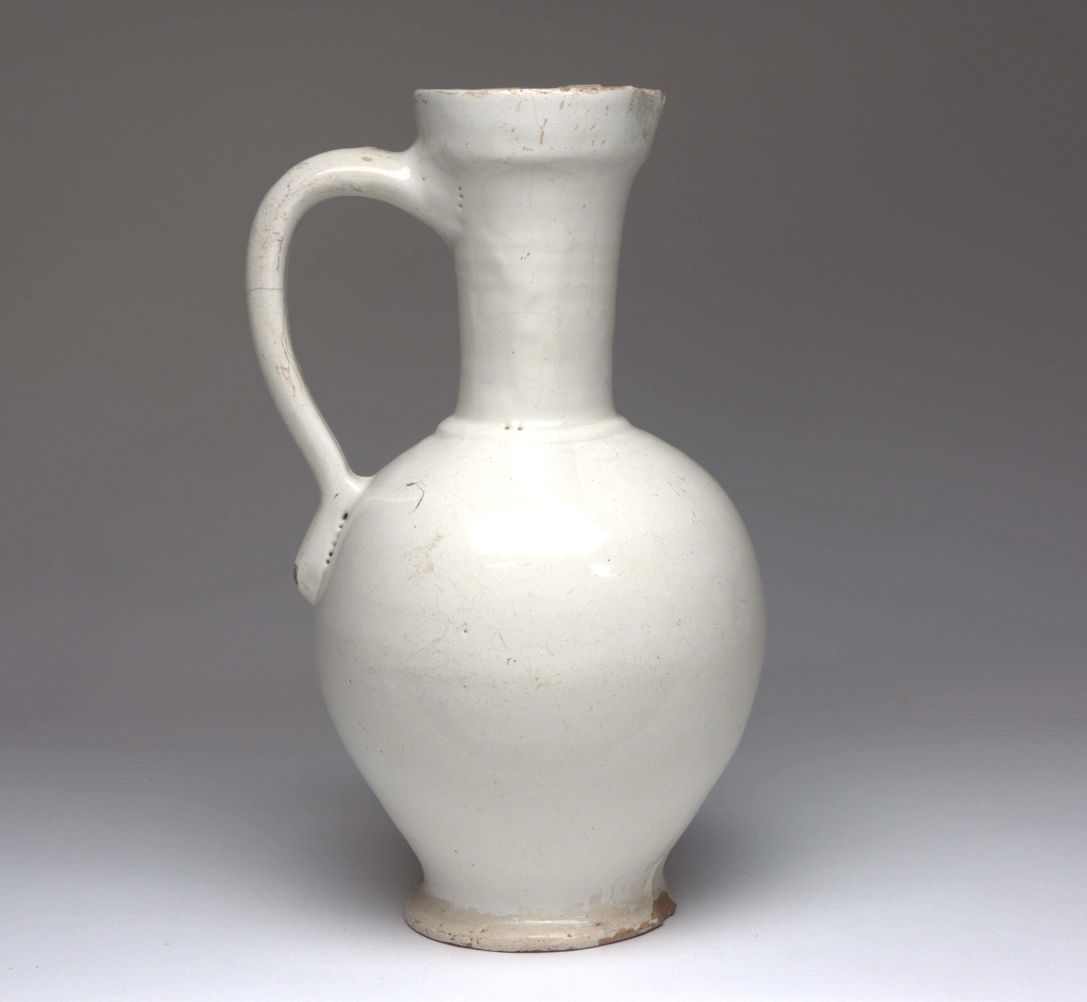 Kan met bolvormige buik; ingetrokken voet met standvlak; smalle cilindervormige hals met brede verdikte mondrand en schenklip; C-vormig oor; geprofileerde ring rond schouder; ongedecoreerd; (Nederlands)