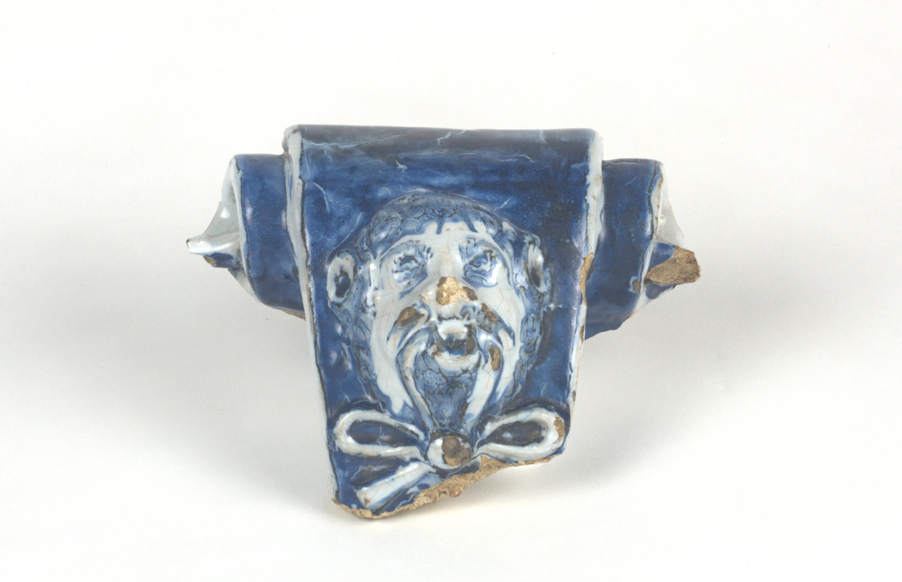 Console met masker: opgerolde achterzijde en gebogen voorzijde met geprofileerd masker met strik op blauw fond; achterkant gedeeltelijk geglazuurd. (Nederlands)