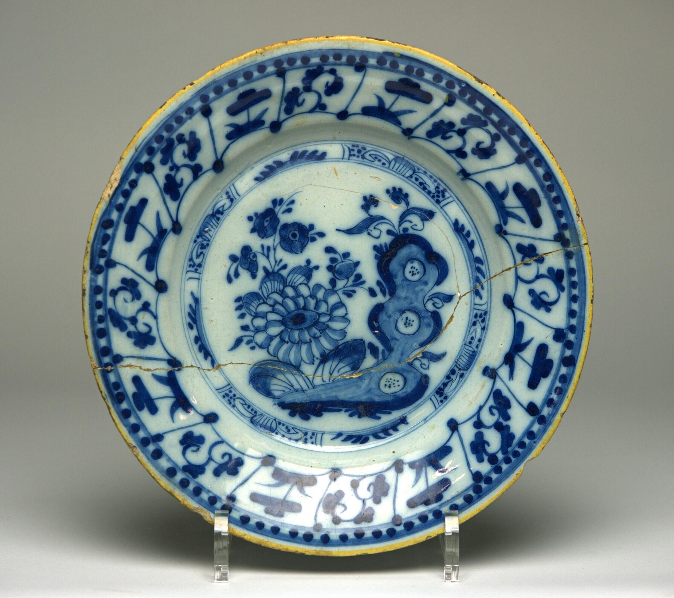 rond, met standring, op het plat een grote bloem in heester (links) en begroeide, verticale rots met drie doorboringen (rechts), het geheel omlijst met concentrische cirkelband, opgebouwd uit smalle velden waarin alternerend halve bloem en gestileerd floraal motief, op de wand aaneengesloten schuine vierkante velden waarin gestileerd bloemornament van tweeërlei soort, omlijst met stippelband en afgebiest met gele rand (Nederlands)
