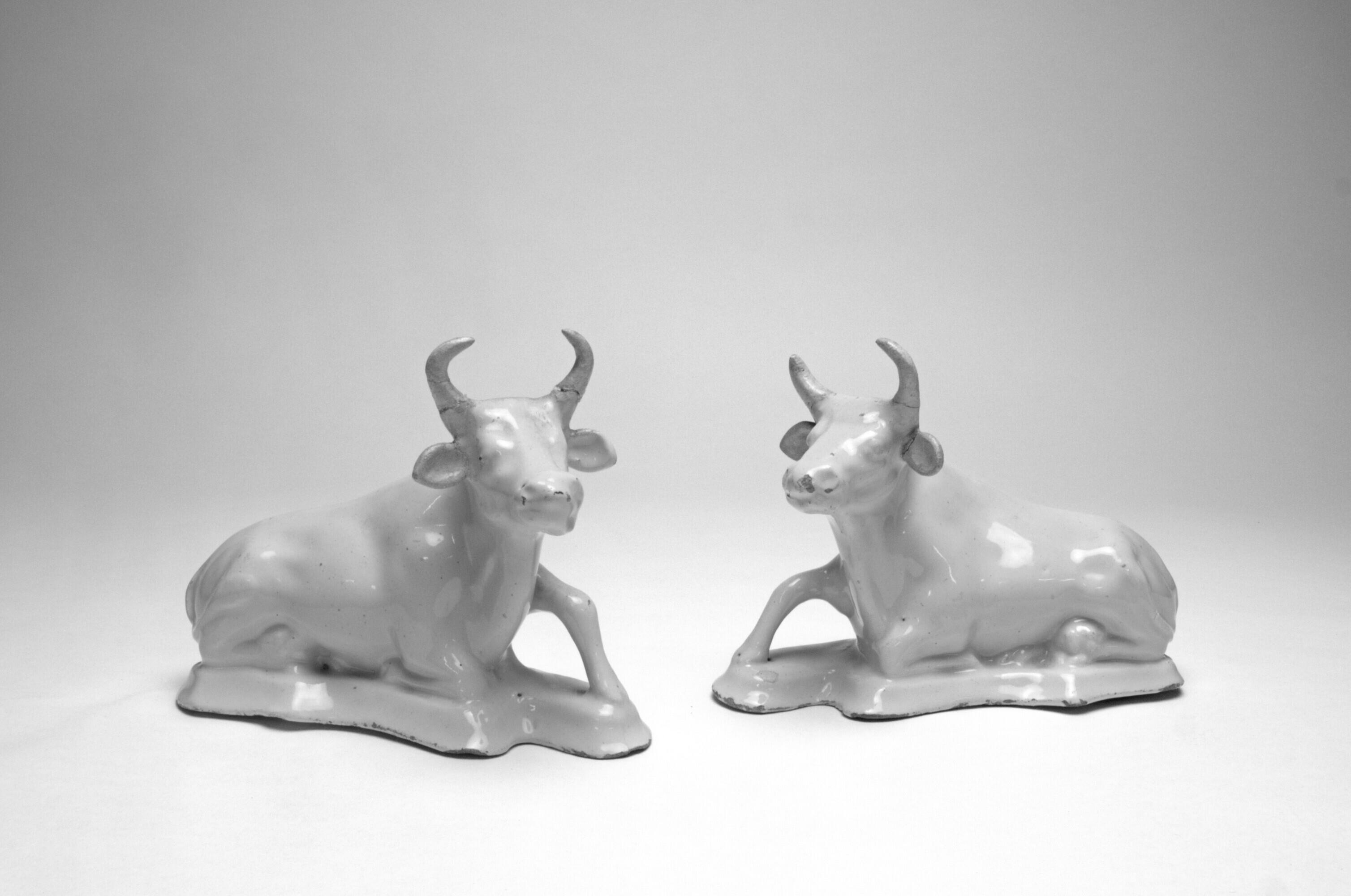stel dierfiguren. koe, liggend, ongedecoreerd, liggend met linker dan wel rechter voorpoot overeind gehouden, oneffen voetstuk met schuine wand (Nederlands)