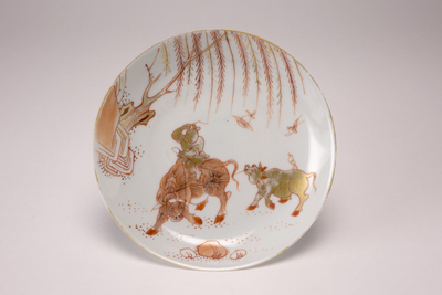 Melk en bloed schoteltje met afbeelding van een persoon, twee karbouwen en een boom, Van Diepencollectie, JMD-P-1032 |