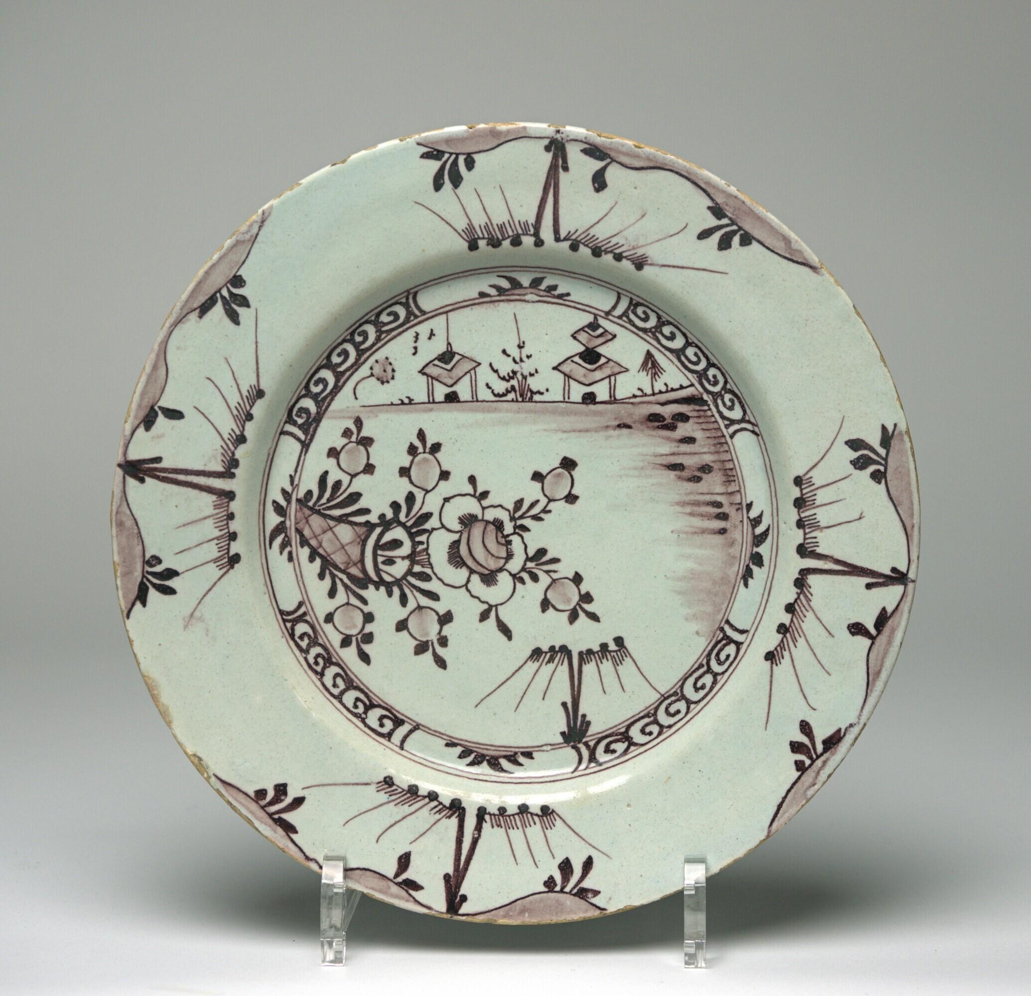 rond met brede voetring. Op het plat een van links komende hoorn waaruit bloemen ontspruiten; op de achtergrond tempeltjes op horizon, aangevuld met begroeïng, op de voorgrond een gespleten gestileerde boom met gespreide takken met bolletjes er aan; het geheel omsloten door cirkelband waarin vier uitsparingen zitten met floraal ornament, afgewisseld door spiralen Op de rand vier maal de gestileerde boom zoals op het plat vrij navolging Chinees decor, kleur licht en donker mangaan. Decor licht en donker paars onderglazuur (landschap, bloemen, randje etc.) Vrije navolging van Chinees decor. (Nederlands)