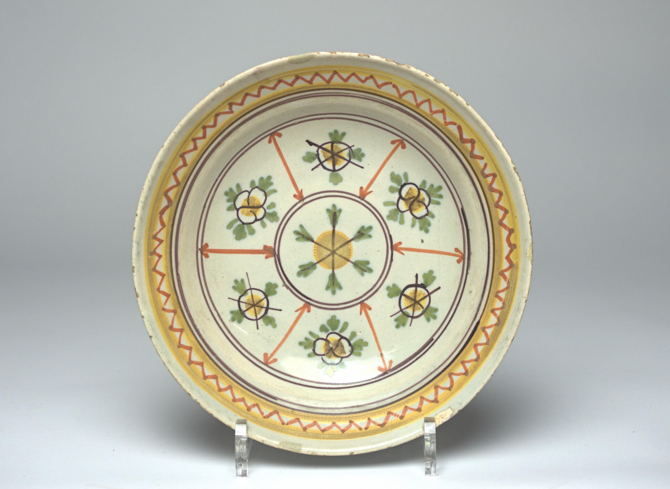 rond zonder standring, komvormig, in het plat een gele gestileerde rozet in dubbele cirkel, daaromheen zes, een door pijlen van elkaar gescheiden, vakindeling waarin alternerend een floraal ornament van tweeërlei soort, het geheel in een dubbele concentrische cirkel, op de rand twee gele biezen, waartussen een oranje zigzaglijn, kleuren, geel, roodbruin, groen en mangaan. Ornamentaal polychroom decor onderglazuur. (Nederlands)