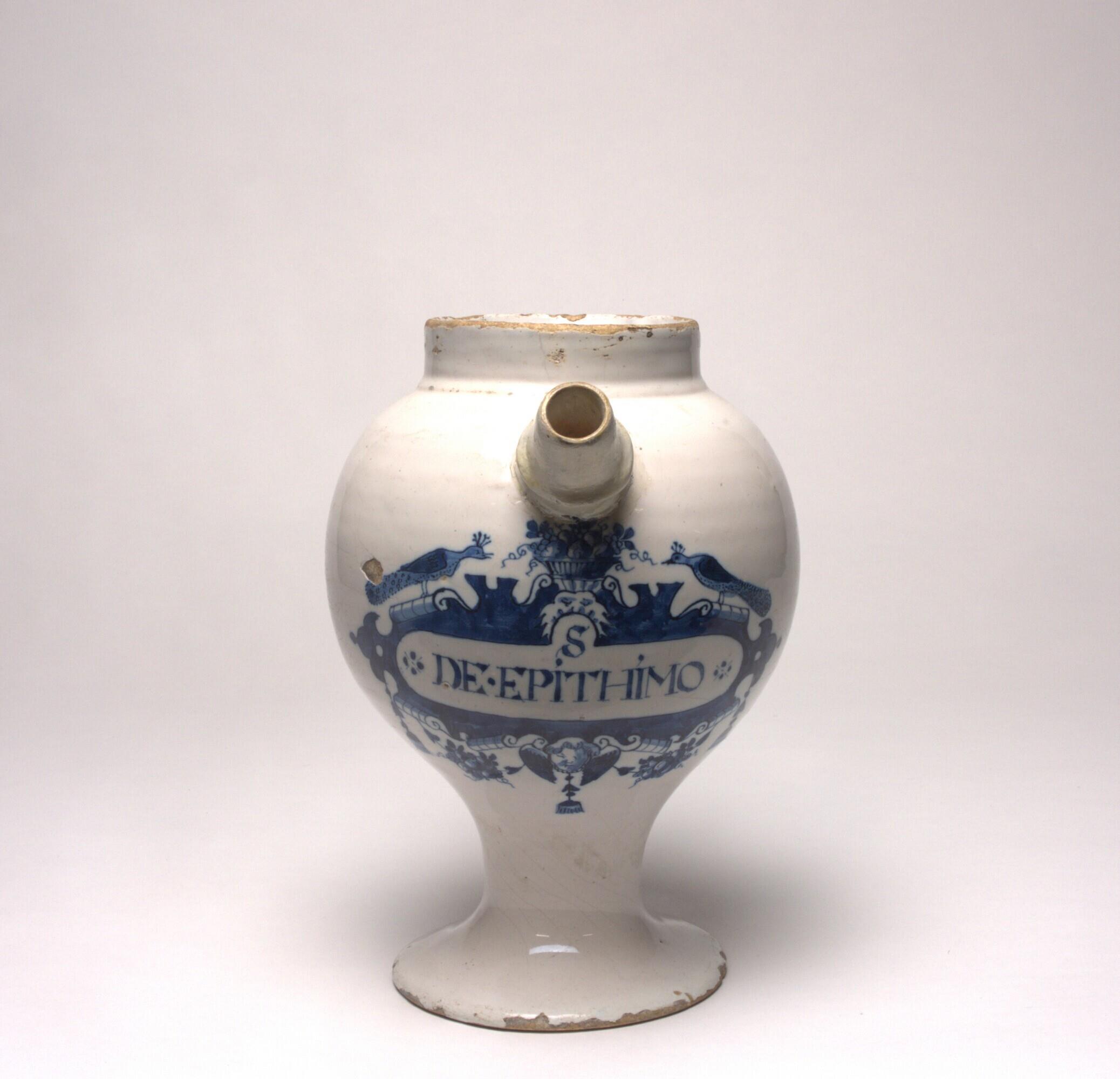 balustervormig met schuine tuit (met verdikt profiel) en ingetrokken mond, brede schacht met koepelvormige voet, in een cartouche-achtige omlijsting met gespiegelde pauwen, fruitmand, engelenkopjes en guirlanden het opschrift 'S DE.EPITHIMO'. Opschrift en omlijsting in blauw onderglazuur. (Nederlands)