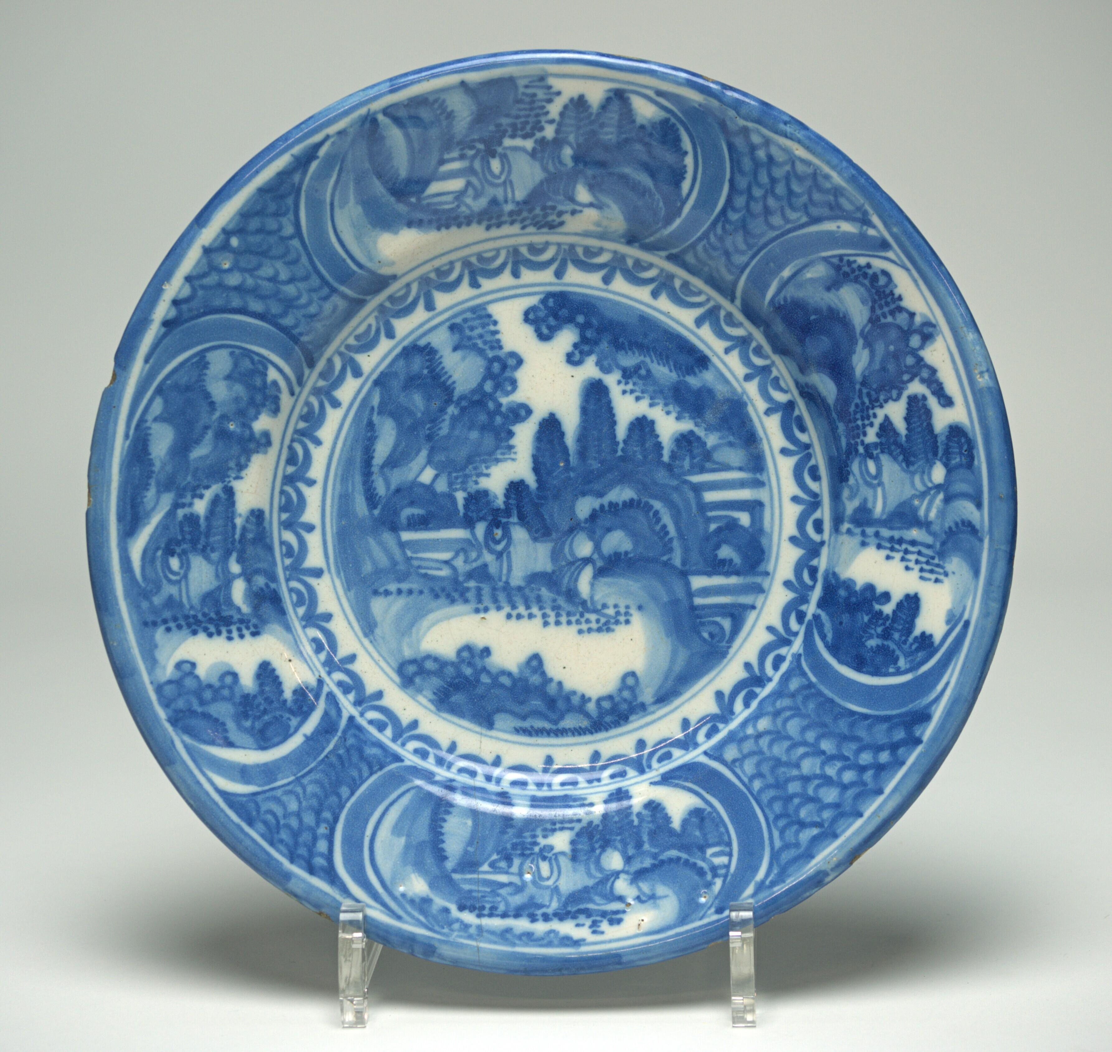 rond met doorboorde standring; in het plat een Chinees in landschap, in cirkellijst, op de rand een schubbenpatroon met vier ovale velden waarin landschap, het blauw is licht van tint, de schildering grof. Dikwandig. Decor lichtblauw onderglazuur. In centrum landschap, rand met landschap in 4 vakken. Overigens ornamentaal decor. Onder Chinees invloed. (Nederlands)