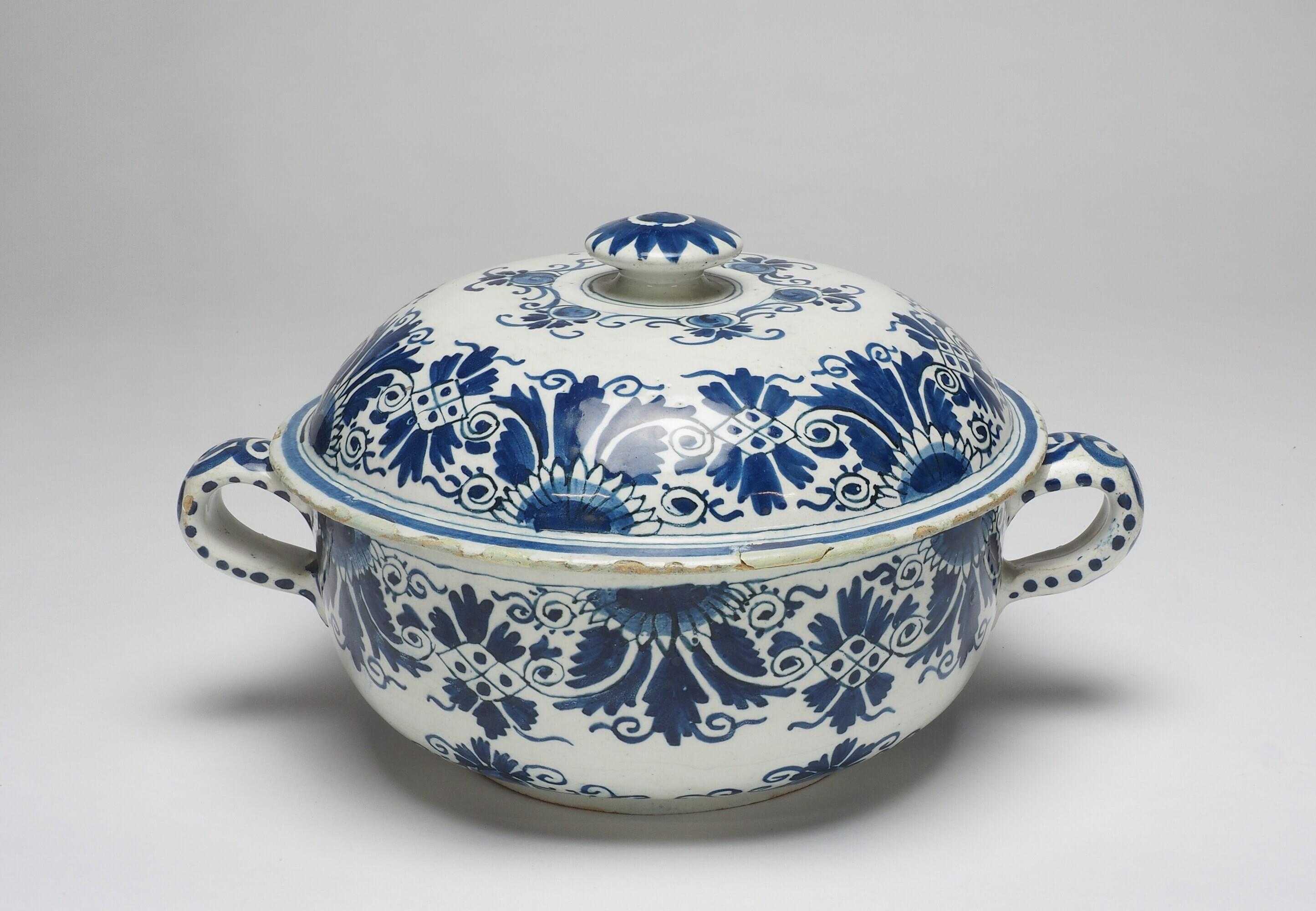 Ronde, lage terrine. Twee staande C-vormige oren en rustend op ingetrokken standring, gedrukt koepelvormig deksel met platte knop op ingesnoerde steel, de binnenzijde is voorzien van ovaalvormig zeefje, op terrine en deksel identiek floraal decor bestaande uit halve zonnebloem met symmetrisch aangebrachte bladeren en krulwerk, afgewisseld ruitvormige bloem, stervorm op dekselknop, daaromheen een gestileerd floraal band, spiralen en stippen op oren. Gestileerd ornamentaal decor in blauw onderglazuur. Een halve maanvormig bakje met gaatjes is tegen bovenrand van binnen aangebakken. (Nederlands)