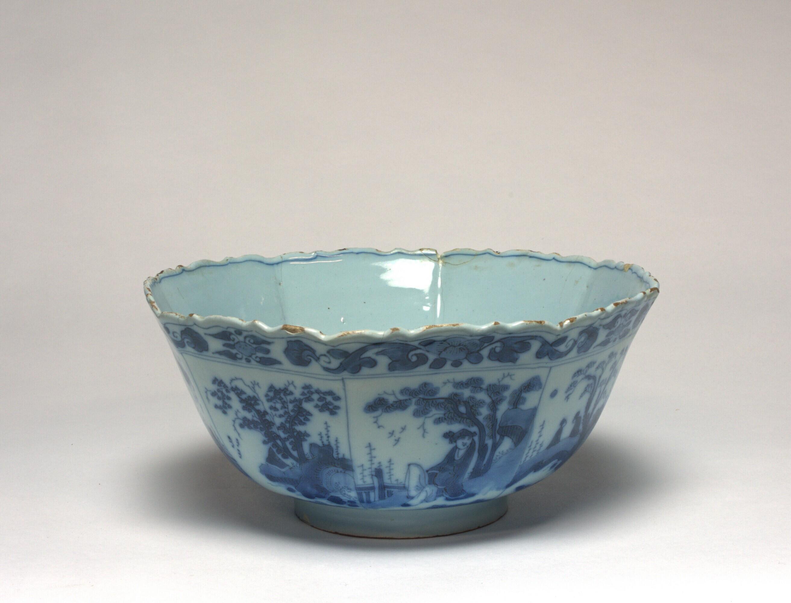 Kom met achtzijdige hoge wand met geaccoladeerde rand en standring, met in het plat in driedubbele cirkellijst twee zittende Chinezen in tuin bij gegroeide hoge rots, links een hek, de één reikt de ander voorwerp aan. Op de buitenwand acht wandvlakken met vier verschillende tafereeltjes met rotslandschap waarin al dan niet zittende of staande Chinees en tegen de bovenrand een band van florale ornamenten (licht grijzig blauw en blauwig zwarte 'trek'). (Nederlands)