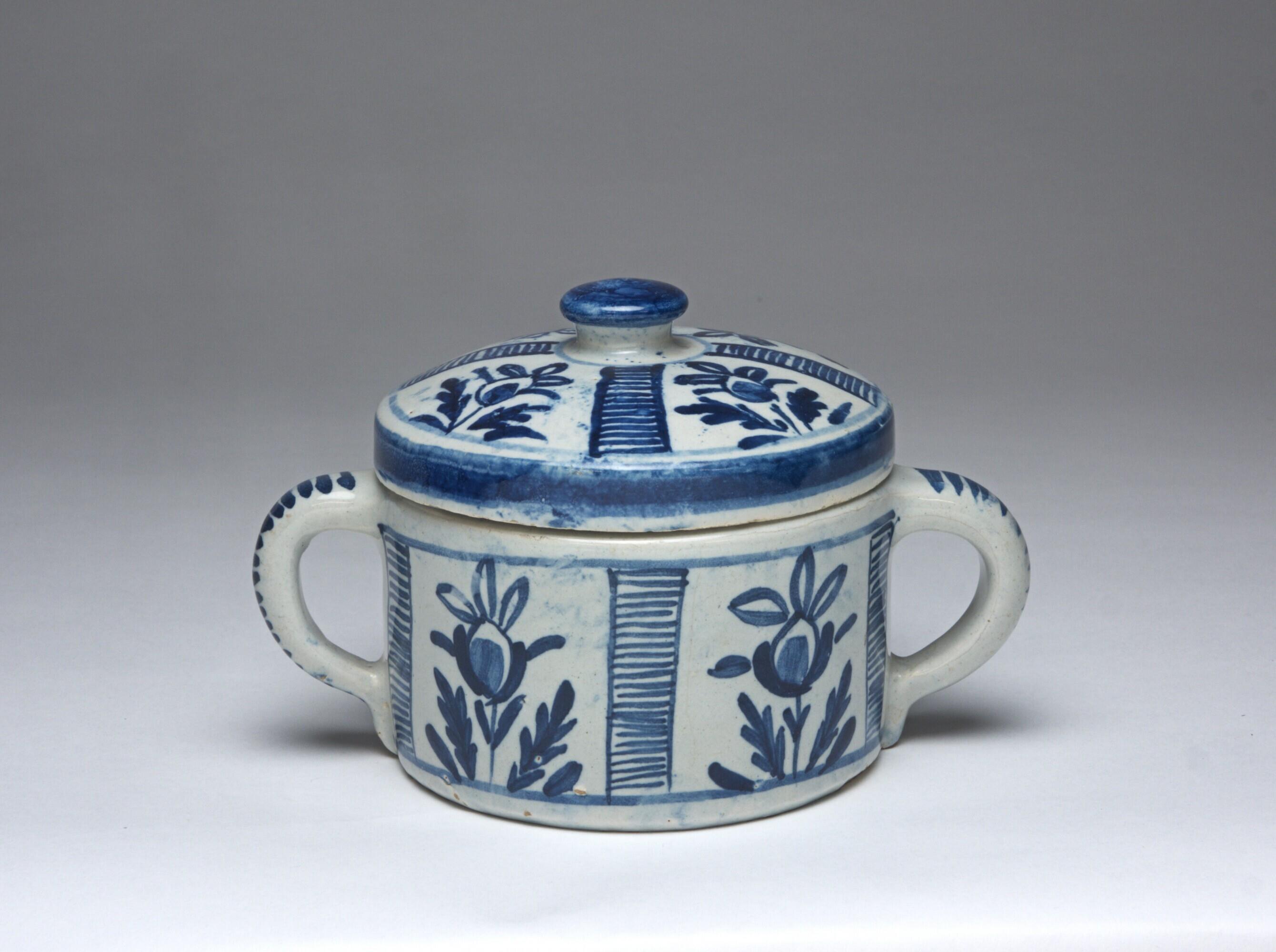 cilindervormig met twee staande C-vormige oren en plat deksel met blauwe knop, aan weerszijden van de romp twee rechthoekige vakken, geflankeerd door smalle stroken met streepjes, in de vakken een bloemmotief, op het oor streepjes, hetzelfde patroon op deksel, chinese invloed. Met 2 oren en deksel. Decor blauw onderglazuur. Bloemen onder Chinese invloed, afgescheiden door uit streepjes samengestelde stroken. (Nederlands)